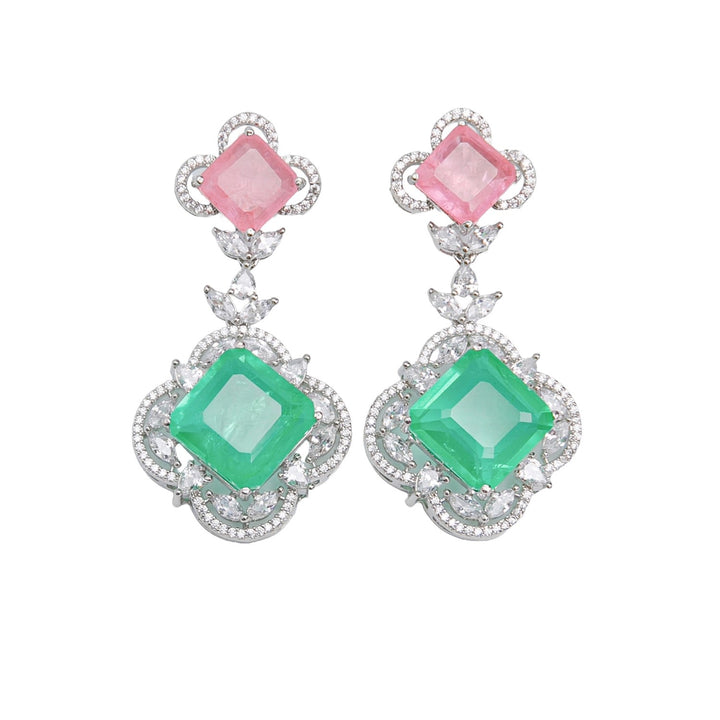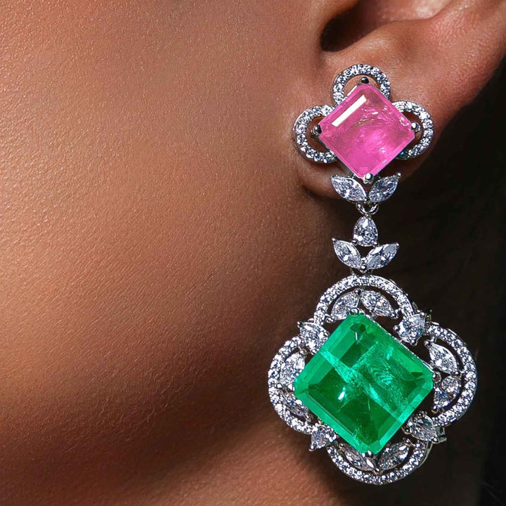 These Voyage Multicolour Earrings by Meraki by Rashmi Bajaj are a stunning and vibrant accessory that beautifully blends sophisticated design with a touch of elegance. The push-back earrings feature striking semi-precious multicolor doublets, surrounded by sparkling premium quality American diamonds. These earrings are designed to captivate and shine, making them a perfect statement piece for formal events and special occasions where you want to stand out.