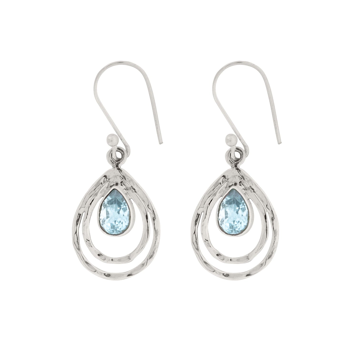 The Infinity Universe Silver Drop Earrings - Blue Topaz by Charlotte's Web Jewellery are a dazzling pair of handmade drop earrings. They feature stunning blue topaz gemstones set within double teardrops with hammered detailing. Adorned with the November birthstone, these earrings are designed to inspire creativity and enhance communication skills.