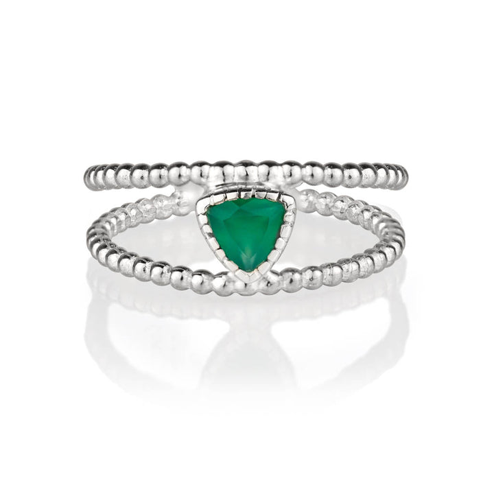 This Trillion Rawa Silver Stacking Ring - Green Onyx by Charlotte's Web Jewellery is a look-good, feel-good piece. This double-band ring features a trillion-cut green onyx stone, which symbolizes strength, positivity, and inner peace. The ring is handmade from recycled silver and features tiny Rawa balls. It's a great piece to wear on its own or to add to a ring stack.
