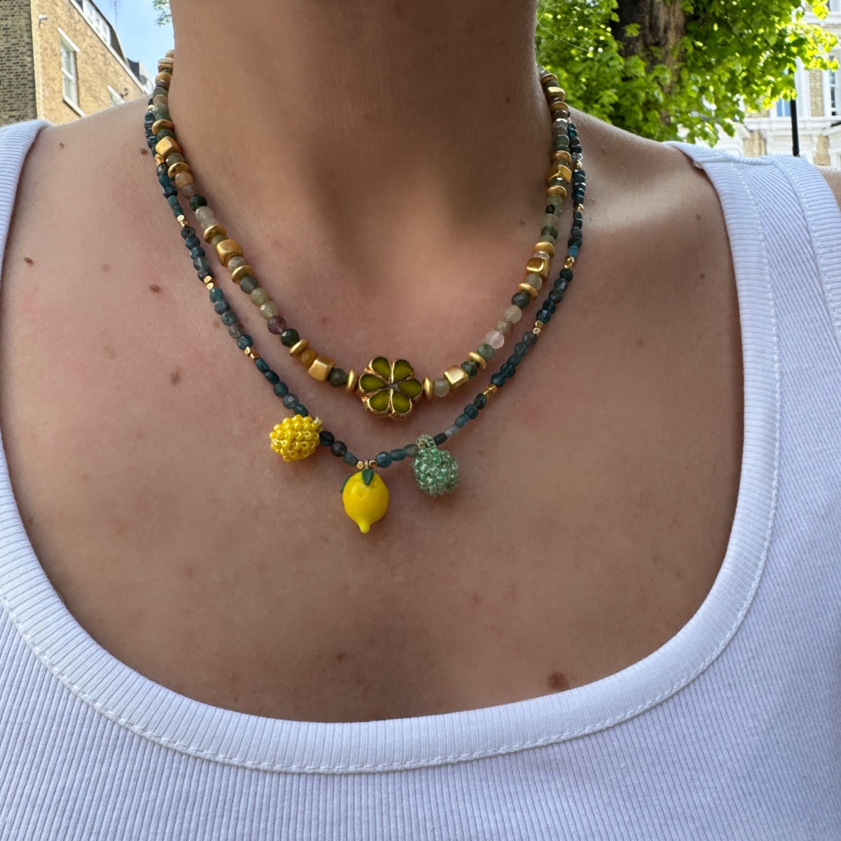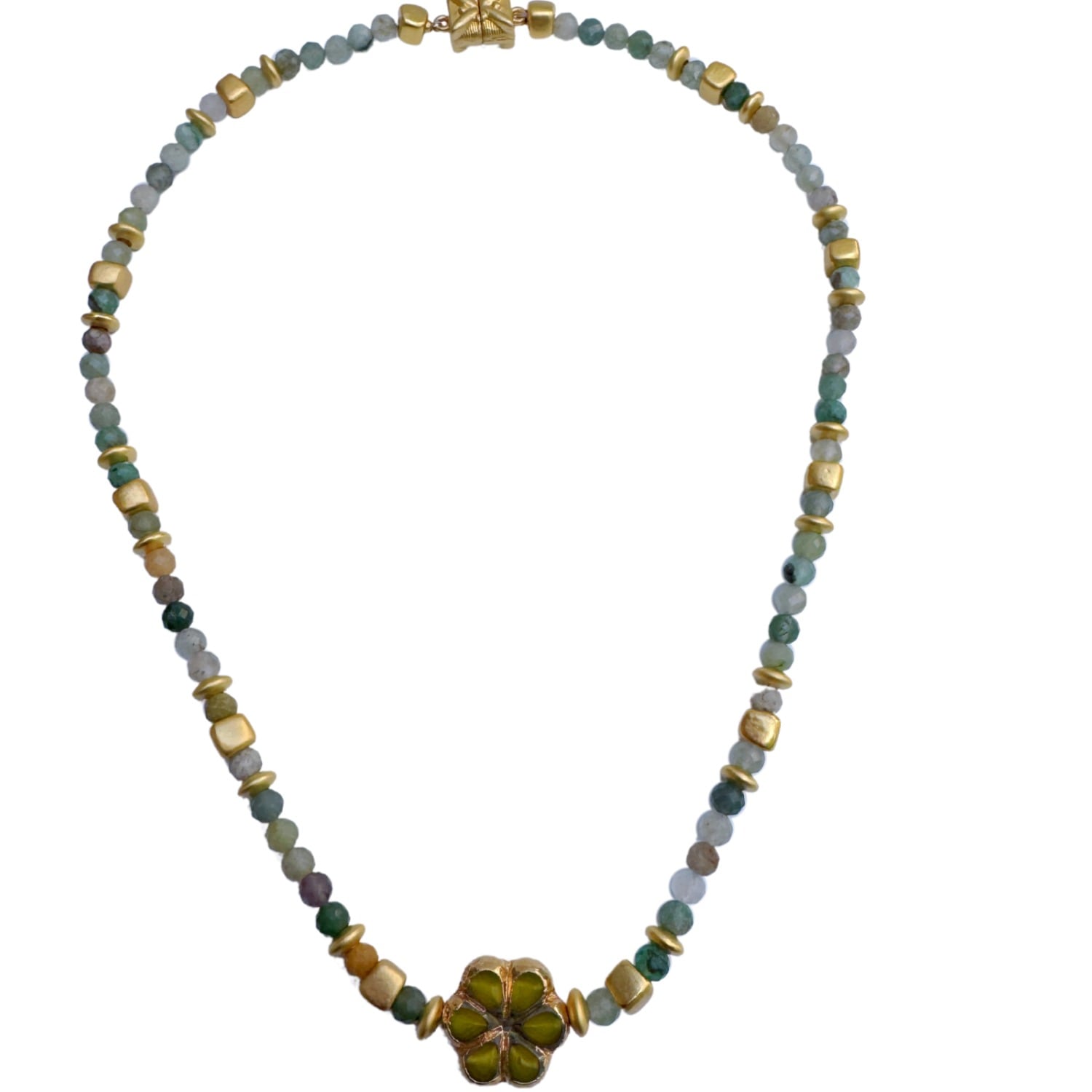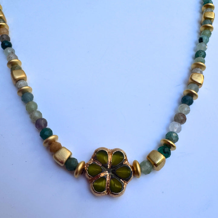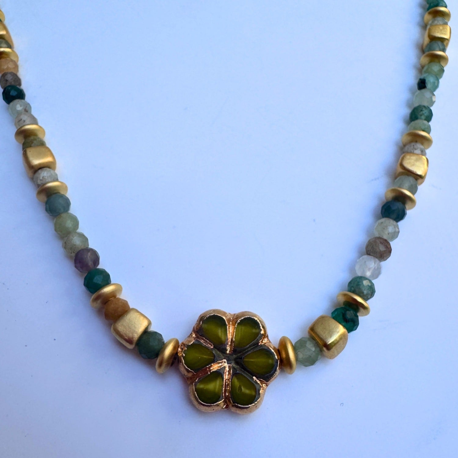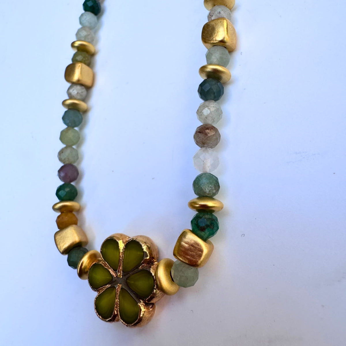 Semi-precious green-toned stones with gold-plated beads. Central green enamel flower charm. Handcrafted design.