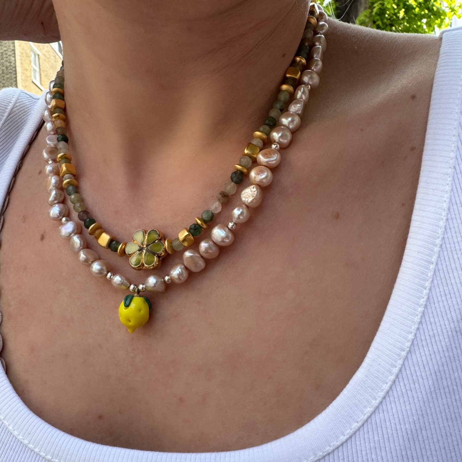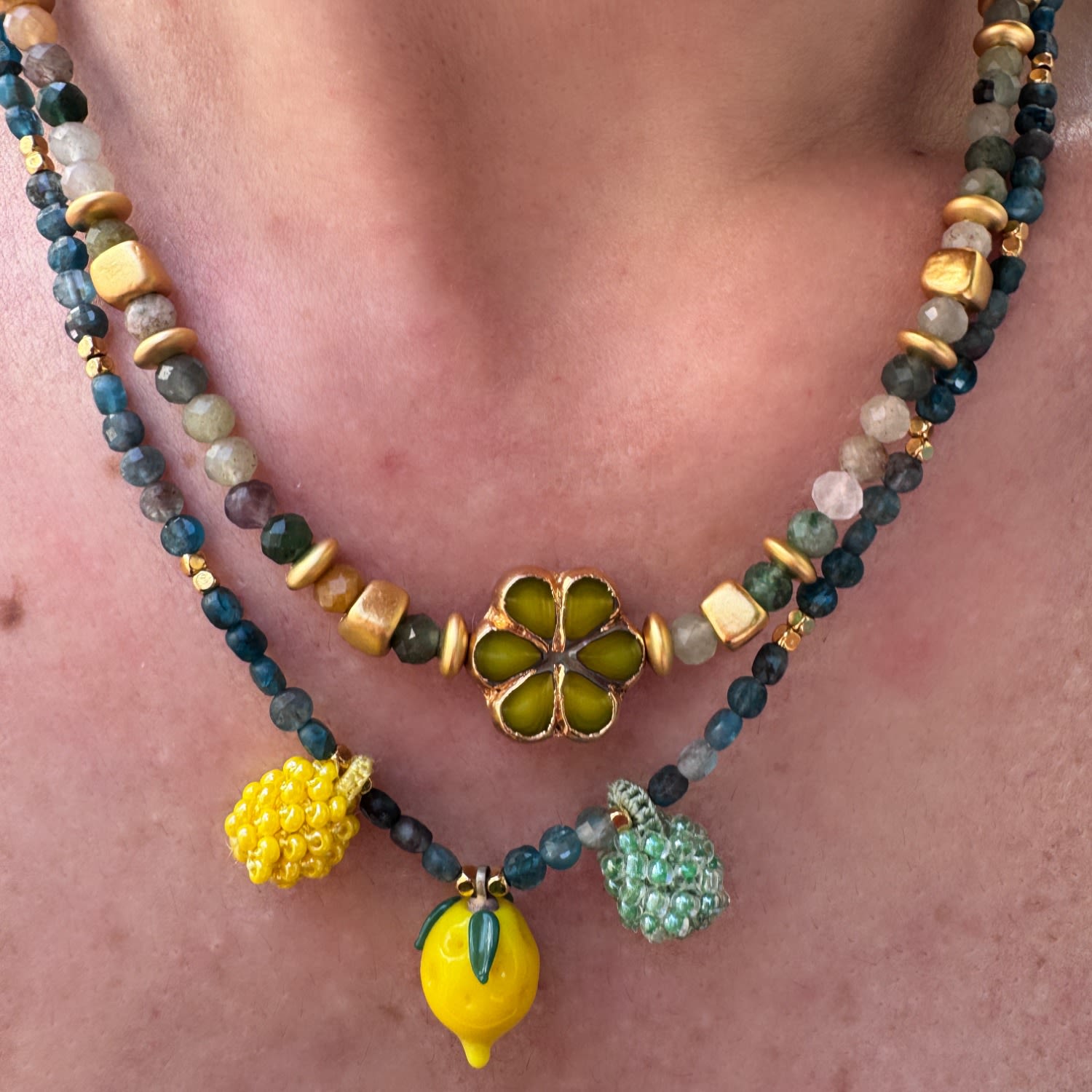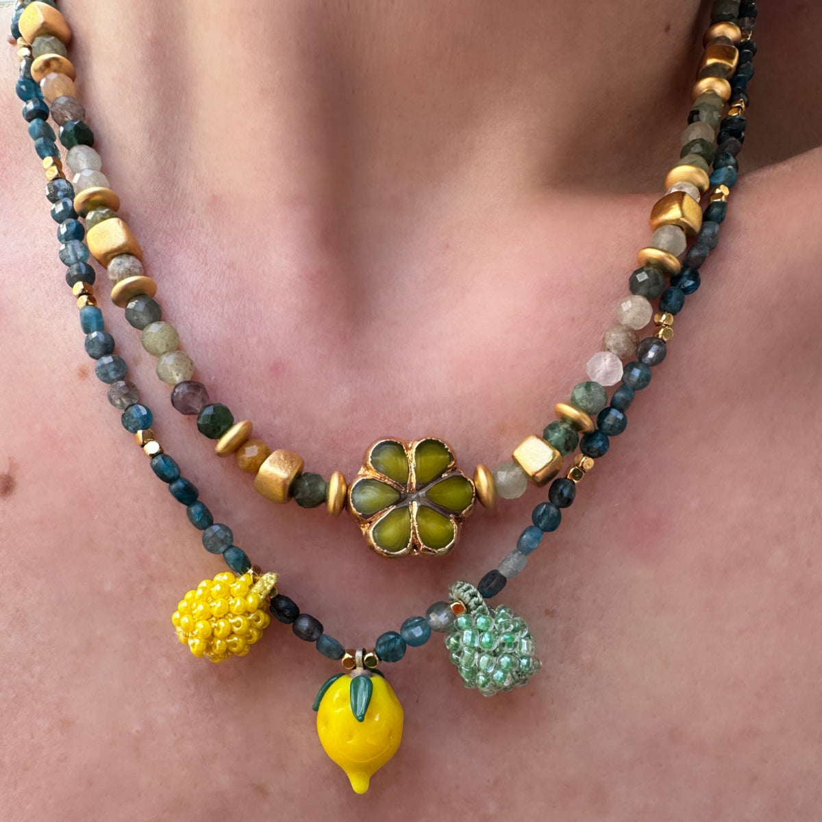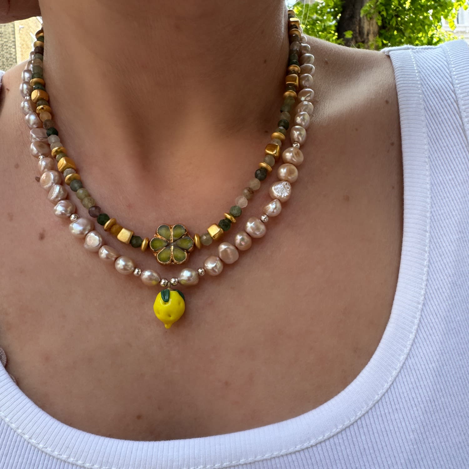 Semi-precious green-toned stones with gold-plated beads. Central green enamel flower charm. Handcrafted design.