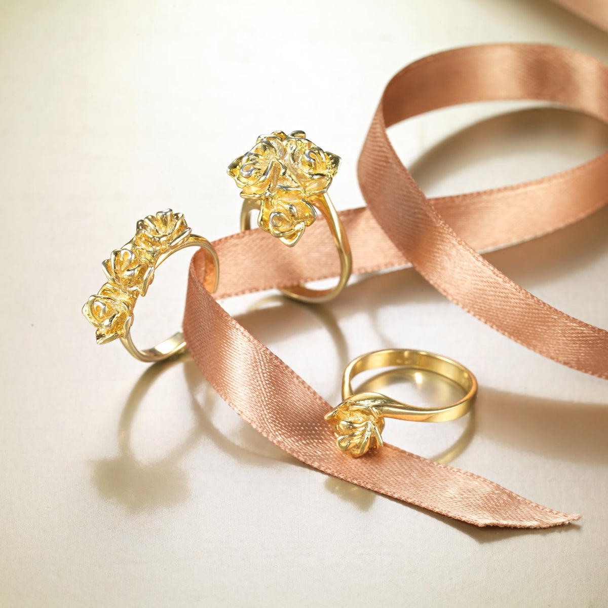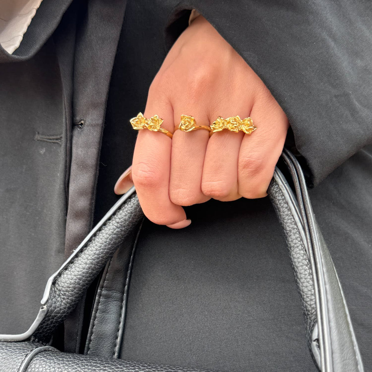 This Gold-Plated Adjustable Ring with Raised Roses by Unaloe captures the poetry of life through the symbol of blooming roses. Each sculpted detail evokes romance and resilience, while its triple-rose design adds volume and elegance. Entirely handmade in Italy, it blends classic charm with modern glamour, becoming a radiant emblem of love and beauty.