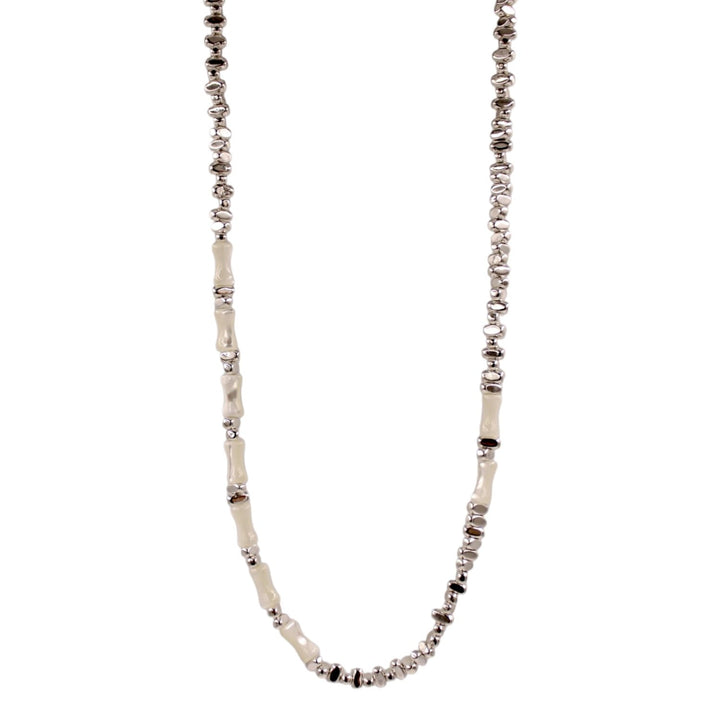 This necklace has a rhodium-plated chain and features a mother of pearl pendant. It is hypoallergenic.