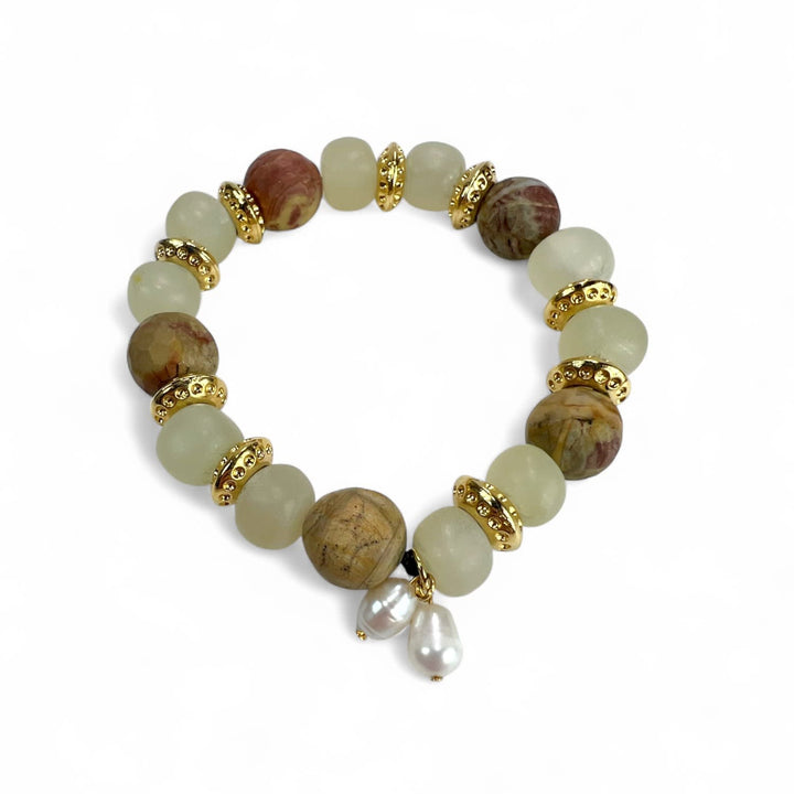 This bracelet is entirely handcrafted with jasper, African beads, natural freshwater pearls, and gold-plated brass.