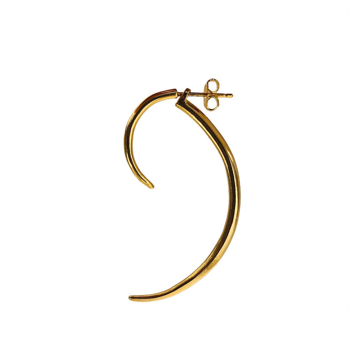 This single hoop earring is made with an 18K gold micron plating on brass. It has a thickness of 3mm and is 2x1 inches long. It is designed to be a front-back earring.