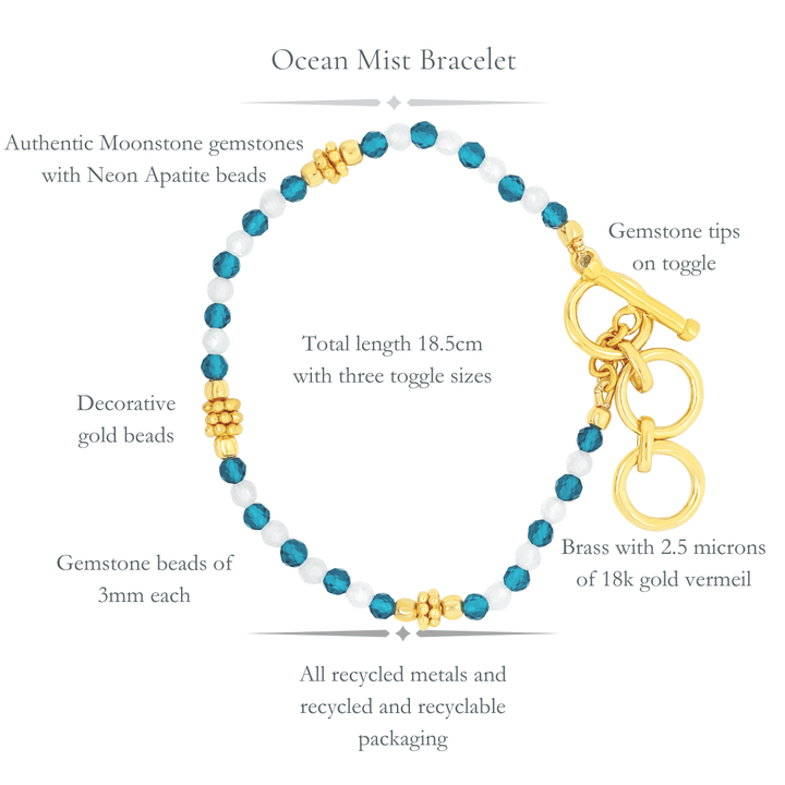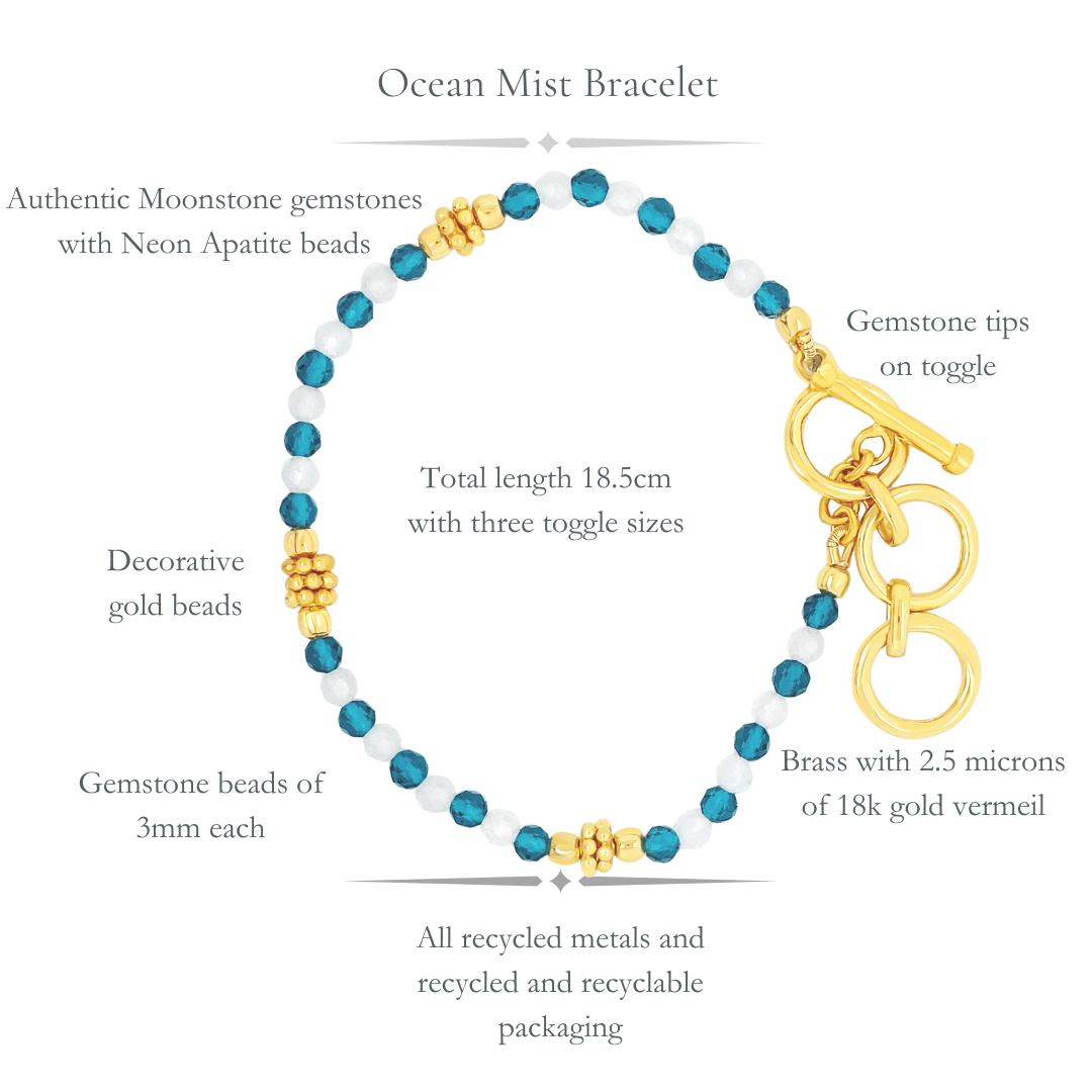 This Ocean Mist Bracelet by Gem Bazaar Jewellery is a delightful and playful piece, part of the mix-and-match Summer Shore Collection. It captures the essence of a serene seascape with its alternating beads of iridescent rainbow moonstone and vibrant neon apatite, interspersed with decorative gold balls. The delicate design and unique toggle clasp, featuring both a moonstone and an apatite bead, add a whimsical touch. This bracelet is an elegant and eco-conscious accessory perfect for a relaxed yet sophisticated look.