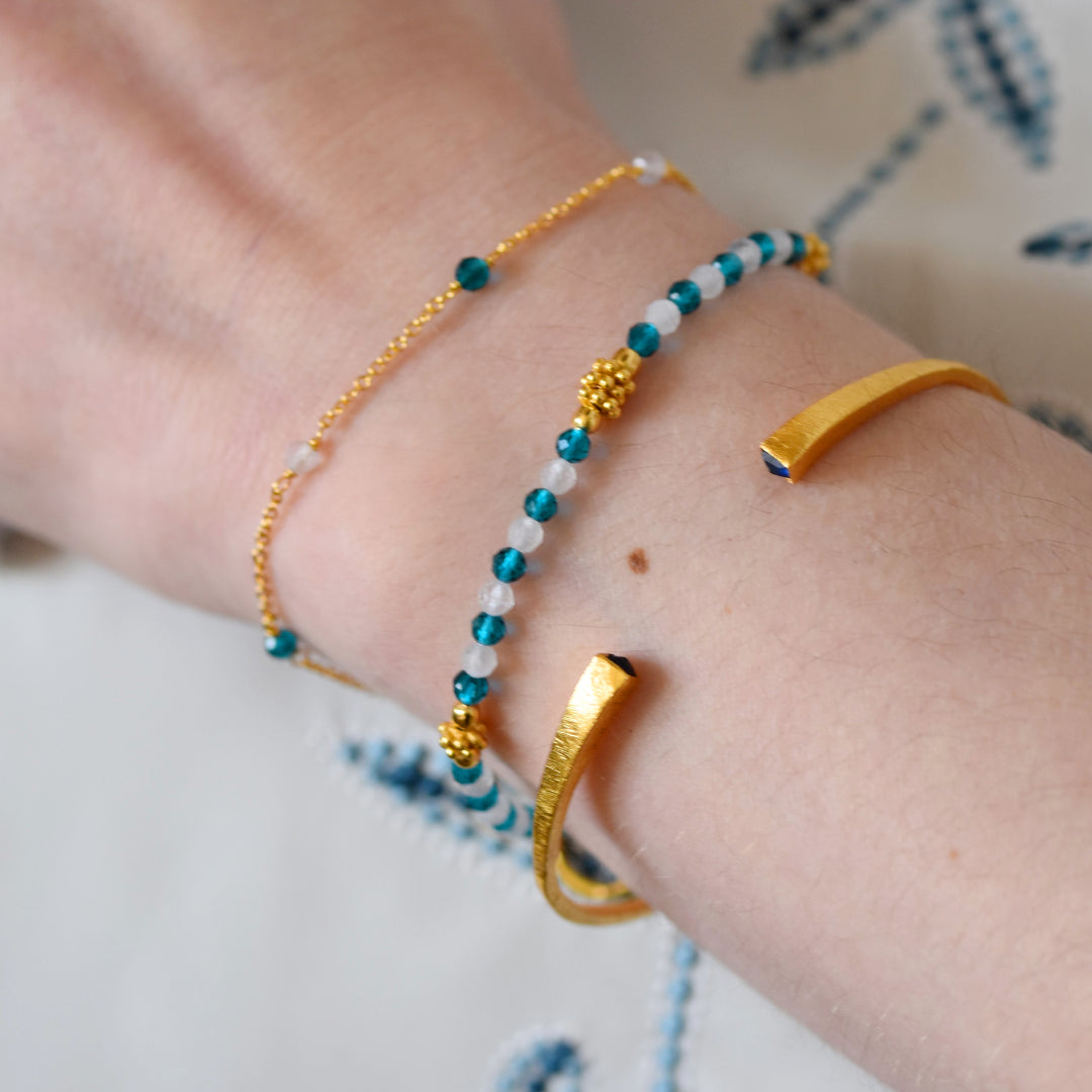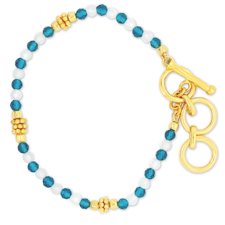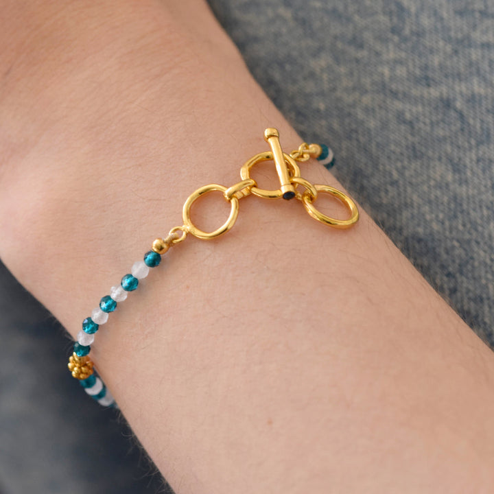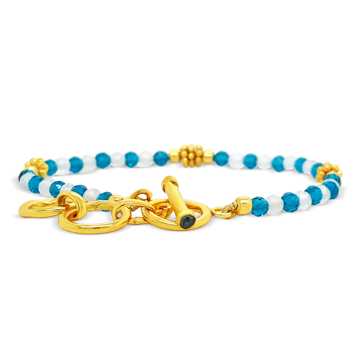 This bracelet is crafted from recycled .925 sterling silver with 2.5 microns of recycled 18k gold vermeil. It features rainbow moonstone and neon (glass) apatite beads. It is fastened with a toggle clasp and has three gold circles to accommodate most wrist sizes.
