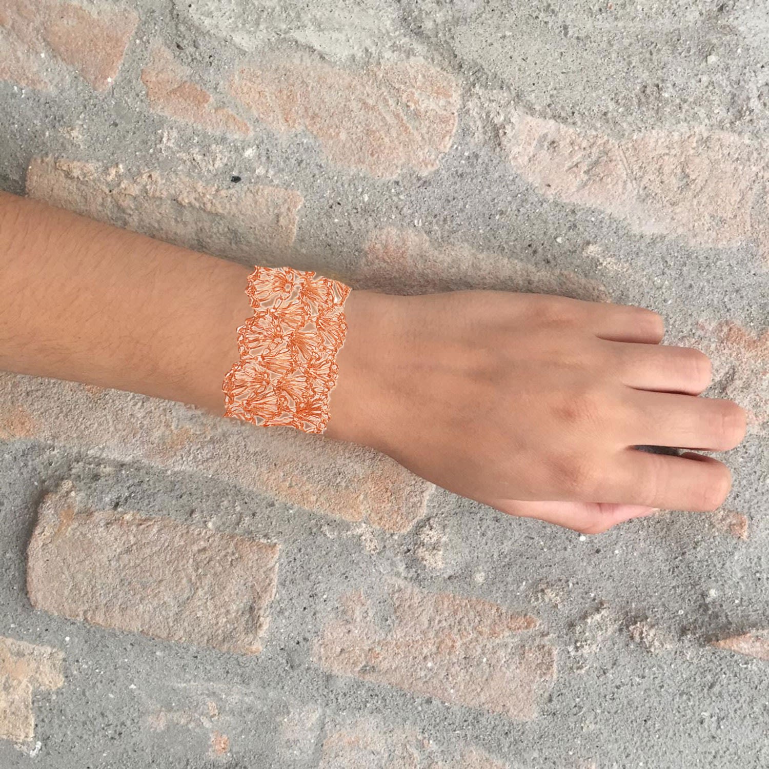 This Rose Gold Shells Handmade Bracelet by Lavish by Tricia Milaneze is a stunning statement piece that is surprisingly light and comfortable. Hand-crocheted by highly skilled Brazilian artisans using 18k rose gold-filled wire, the bracelet creates a beautiful, textural design reminiscent of delicate shells. Each piece is unique, bearing the artist's fingerprints, which gives it a soul and a sense of exclusive artistry. This bracelet is perfect for any occasion, adding a touch of elegant, handcrafted glamour to your look.