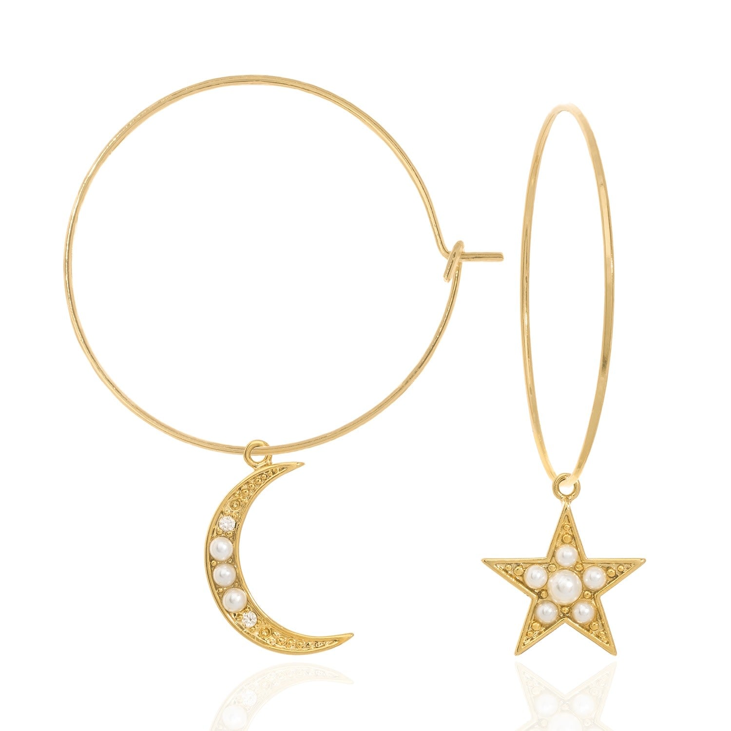 These hoops are 16k yellow gold-plated with a pearl and moon and star charms.
