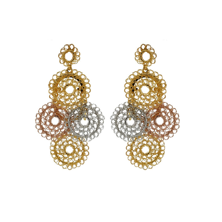 The Trio Gold Mix Juliette Handmade Crochet Earrings by Lavish by Tricia Milaneze are light, comfortable, and stunning. These earrings are made from hand-crocheted 18 karat gold, rose gold, and palladium-filled wire. They feature a wire mandalas chandeliers design that is perfect for any occasion.