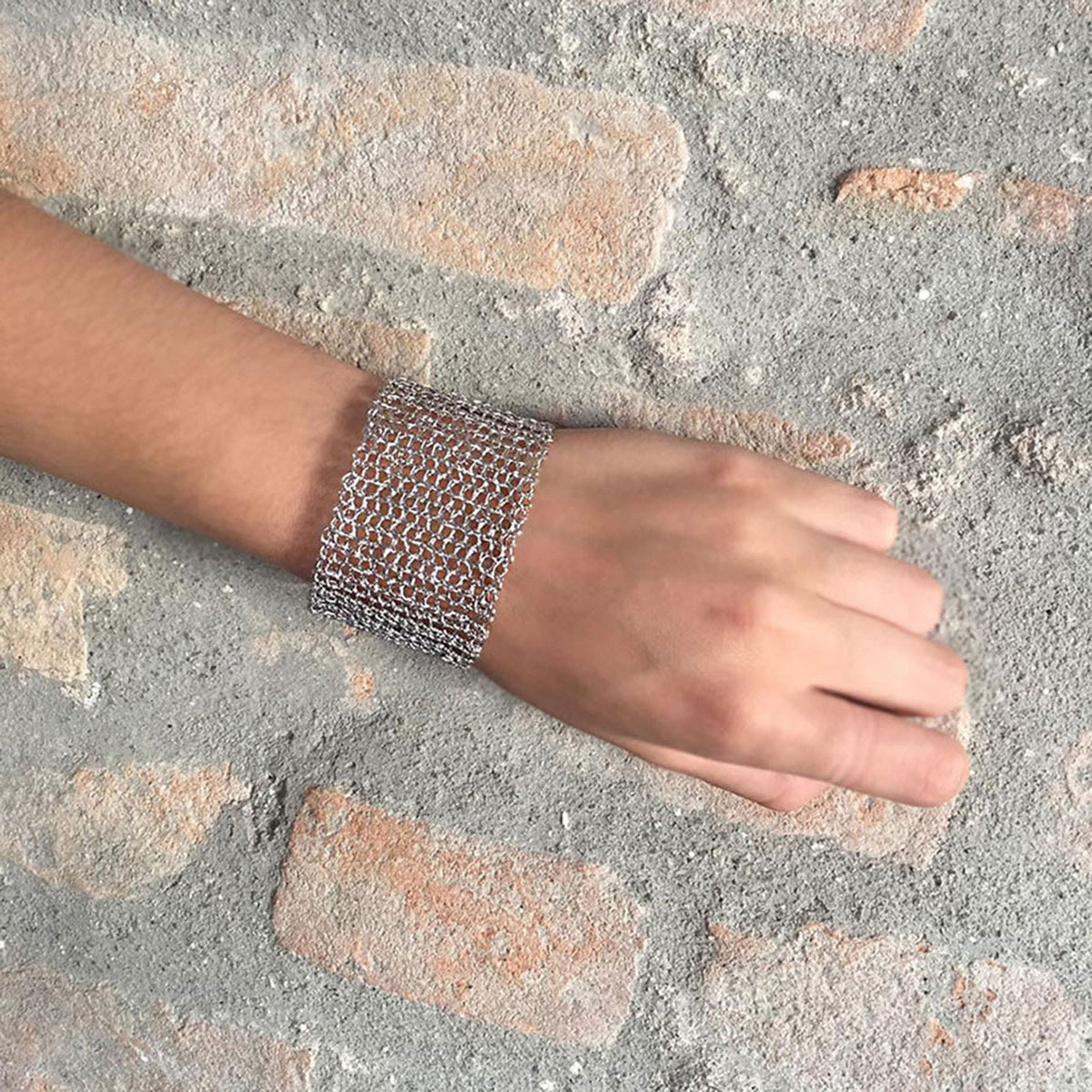 This All Silver Mesh Handmade Bracelet by Lavish by Tricia Milaneze is a delicate and versatile cuff. Fabricated by skilled Brazilian artisans with shiny palladium-filled copper wire, it is very comfortable and light to wear. The hand-crocheted mesh design makes it suitable for every occasion, from casual to formal. It is also made from hypoallergenic and nickel-free material.