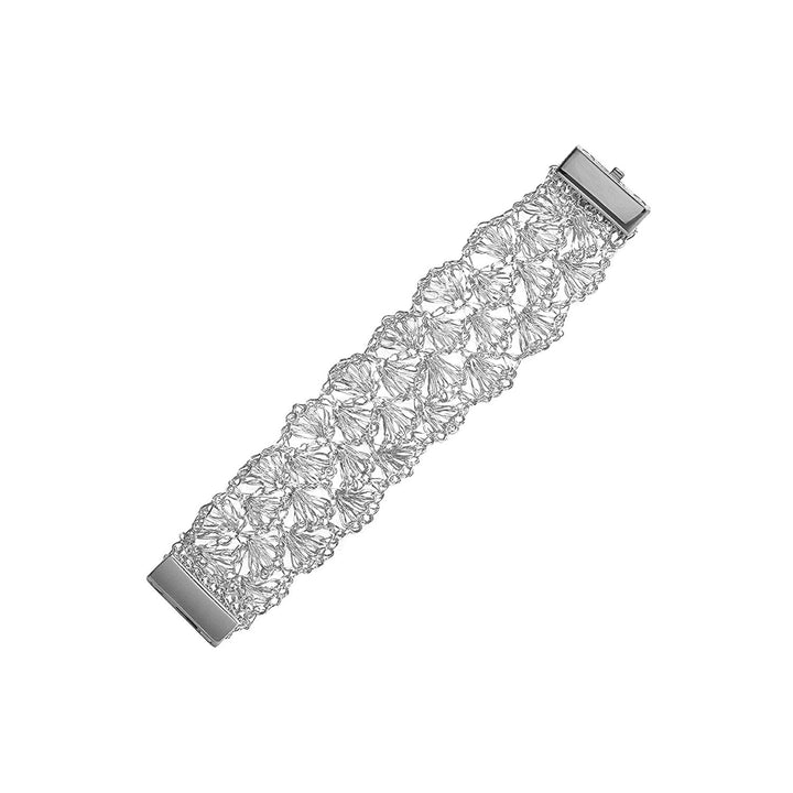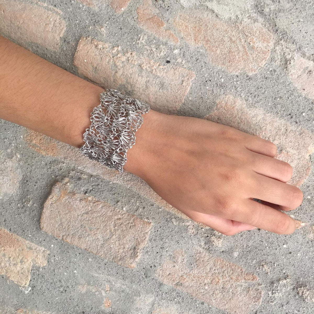The All Silver Shells Handmade Bracelet by Lavish by Tricia Milaneze is a light and comfortable statement piece. This bracelet is hand-crocheted by skilled Brazilian artisans from palladium-filled wire in a shell-like pattern. The aesthetic is elegant yet bold, offering a unique look that is comfortable for everyday wear. Each piece is unique and bears the artist's fingerprints, giving it a special soul and beauty.
