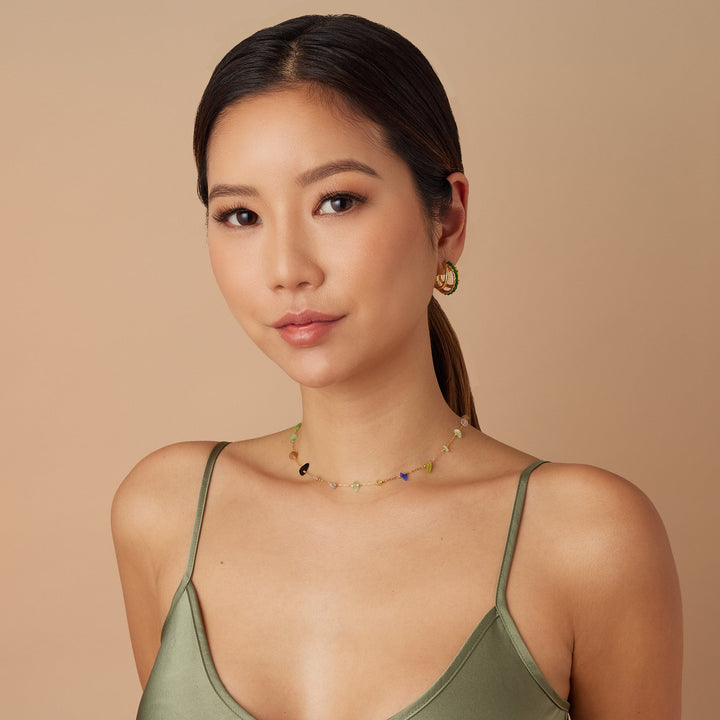 This necklace is made with a nickel-free gold plating and features multi-colored stones. It has a triple-coated finish to prevent tarnishing.