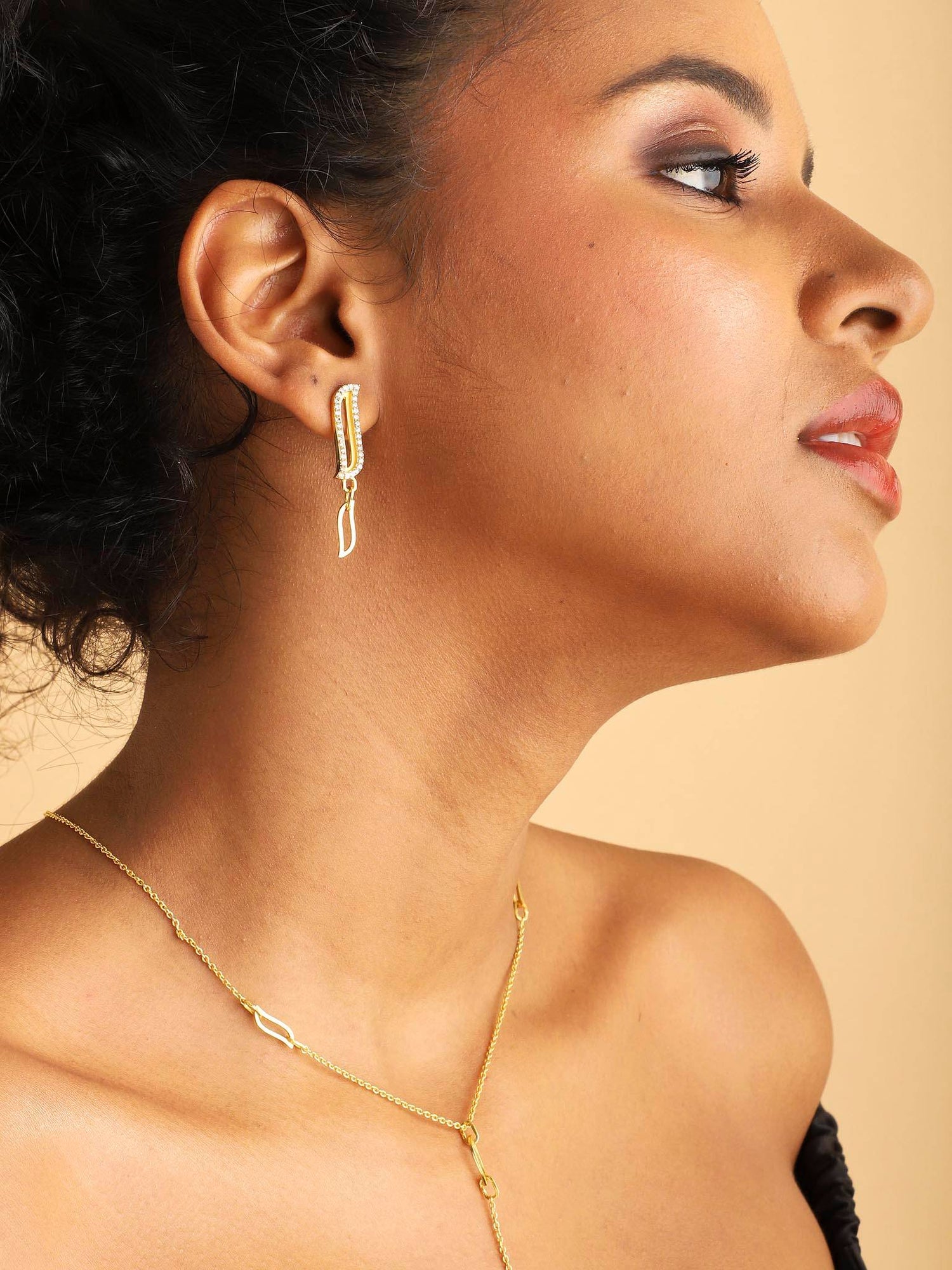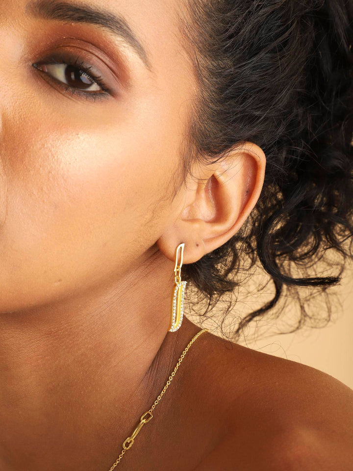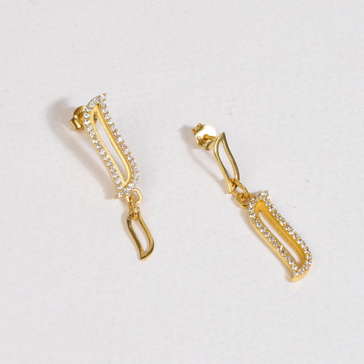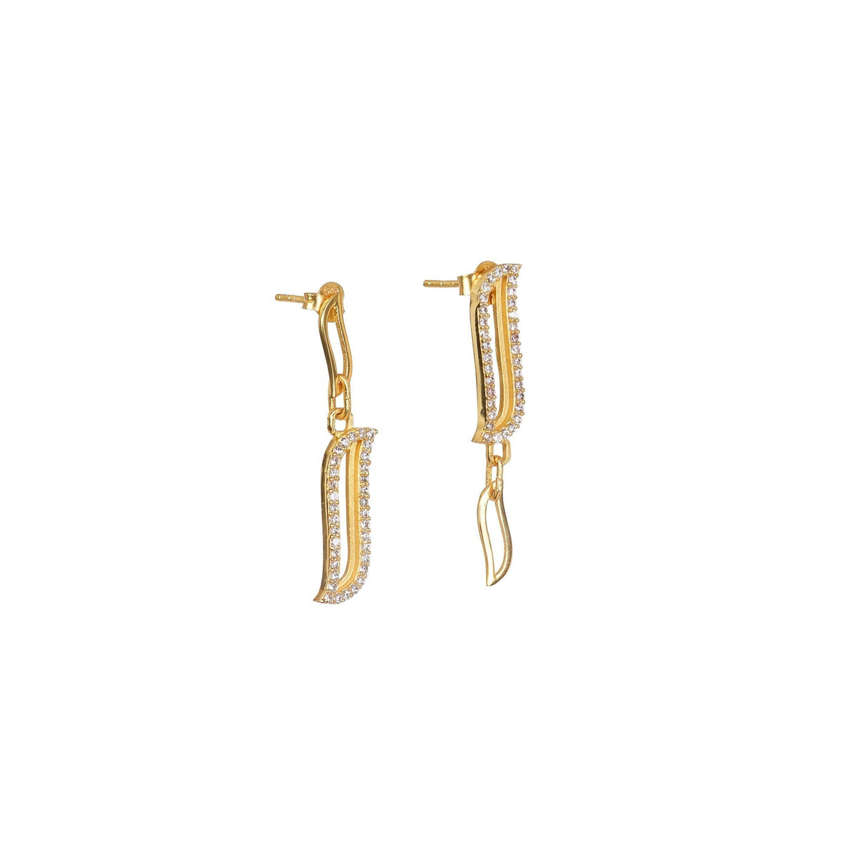 These earrings are hand-finished and plated with 22 carat gold on recycled brass. The posts are made of sterling silver and they feature cubic zirconia stones.