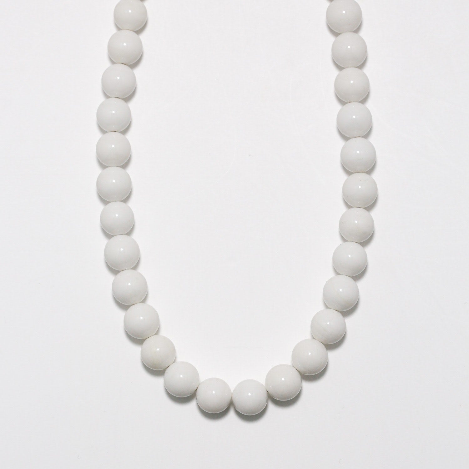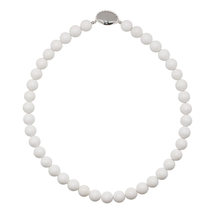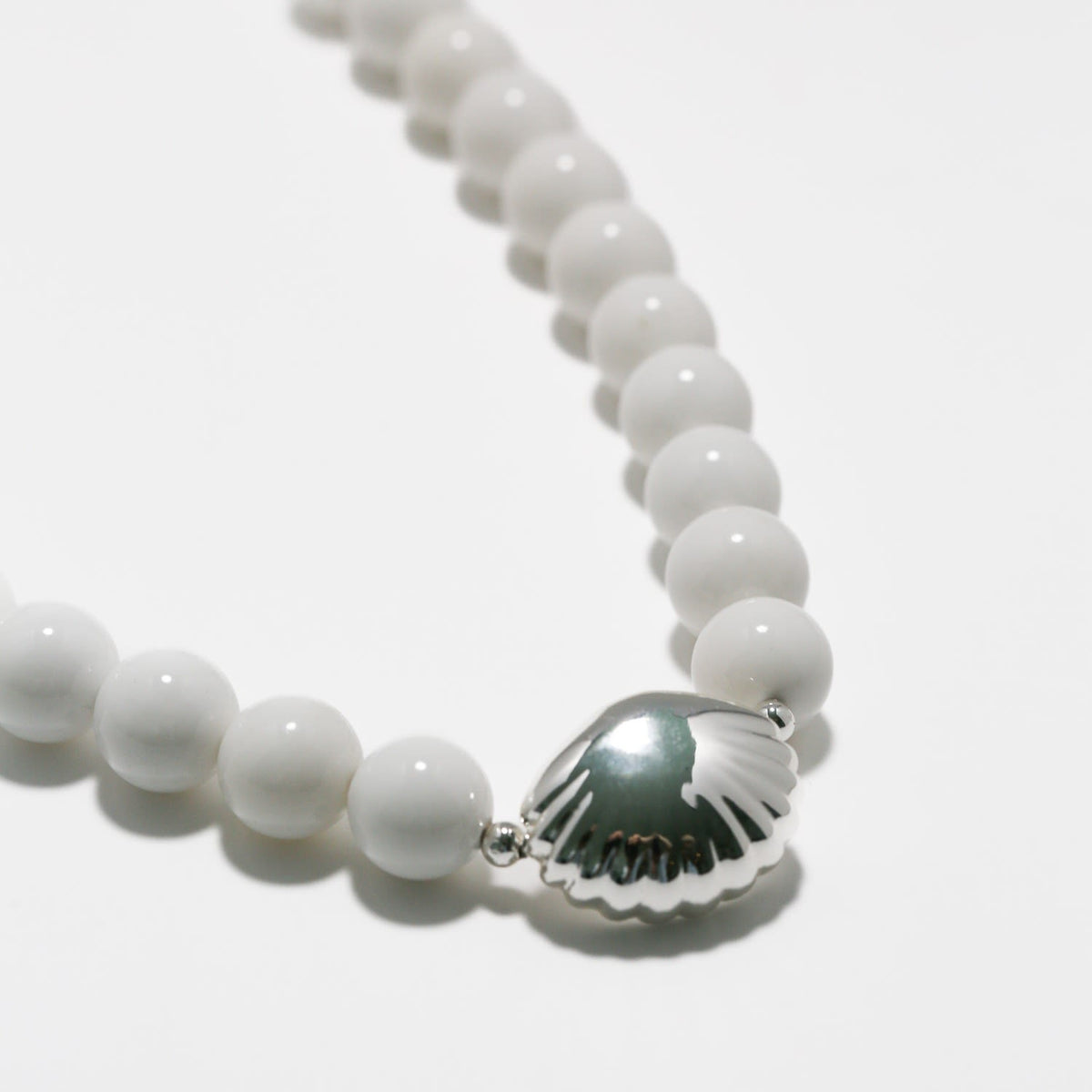 This Clio Bead Necklace White by Miss Cecilia features sleek white onyx beads that offer a refined and sophisticated look. Its shell closure provides a unique and elegant touch, ensuring a secure and stylish fit. This necklace perfectly blends timeless style with contemporary trends, elevating any outfit with its understated luxury and classic appeal. It is a perfect accessory for those who appreciate minimalist design with a touch of unique detail.