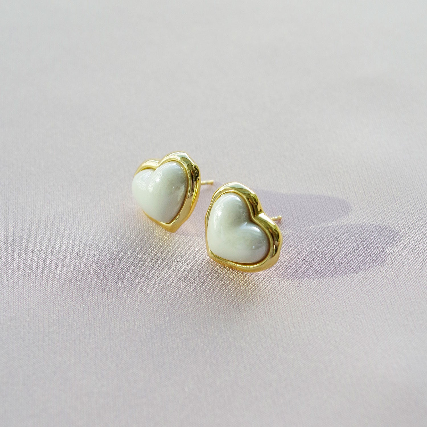 Handmade porcelain hearts with mother-of-pearl lustre. Mounted on 18k gold-plated brass with sterling silver posts. Approx. 14mm x 16mm.