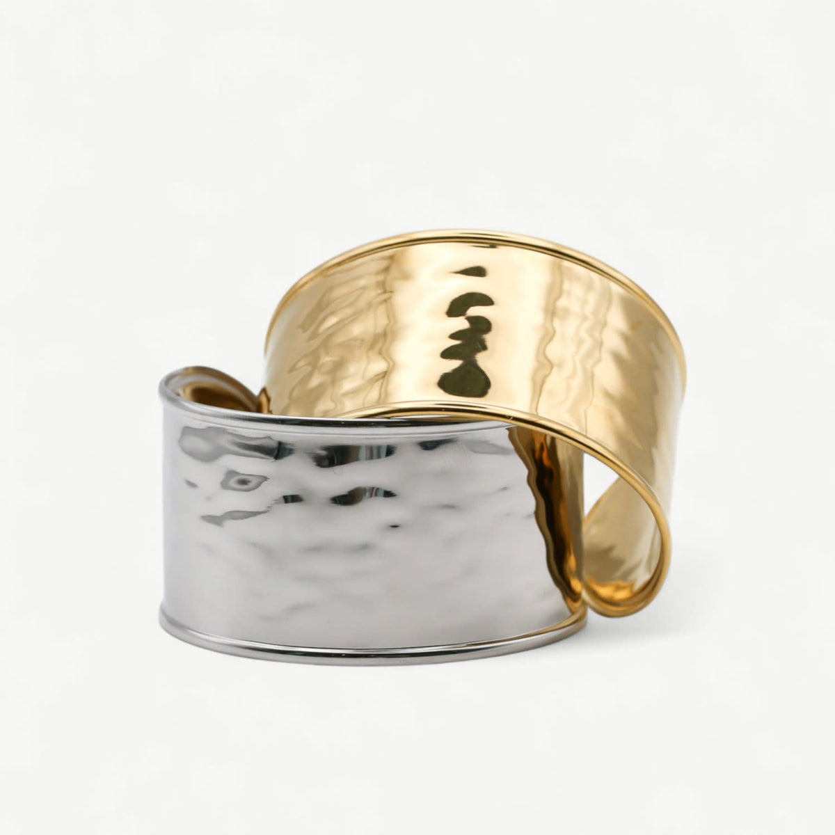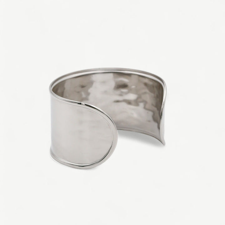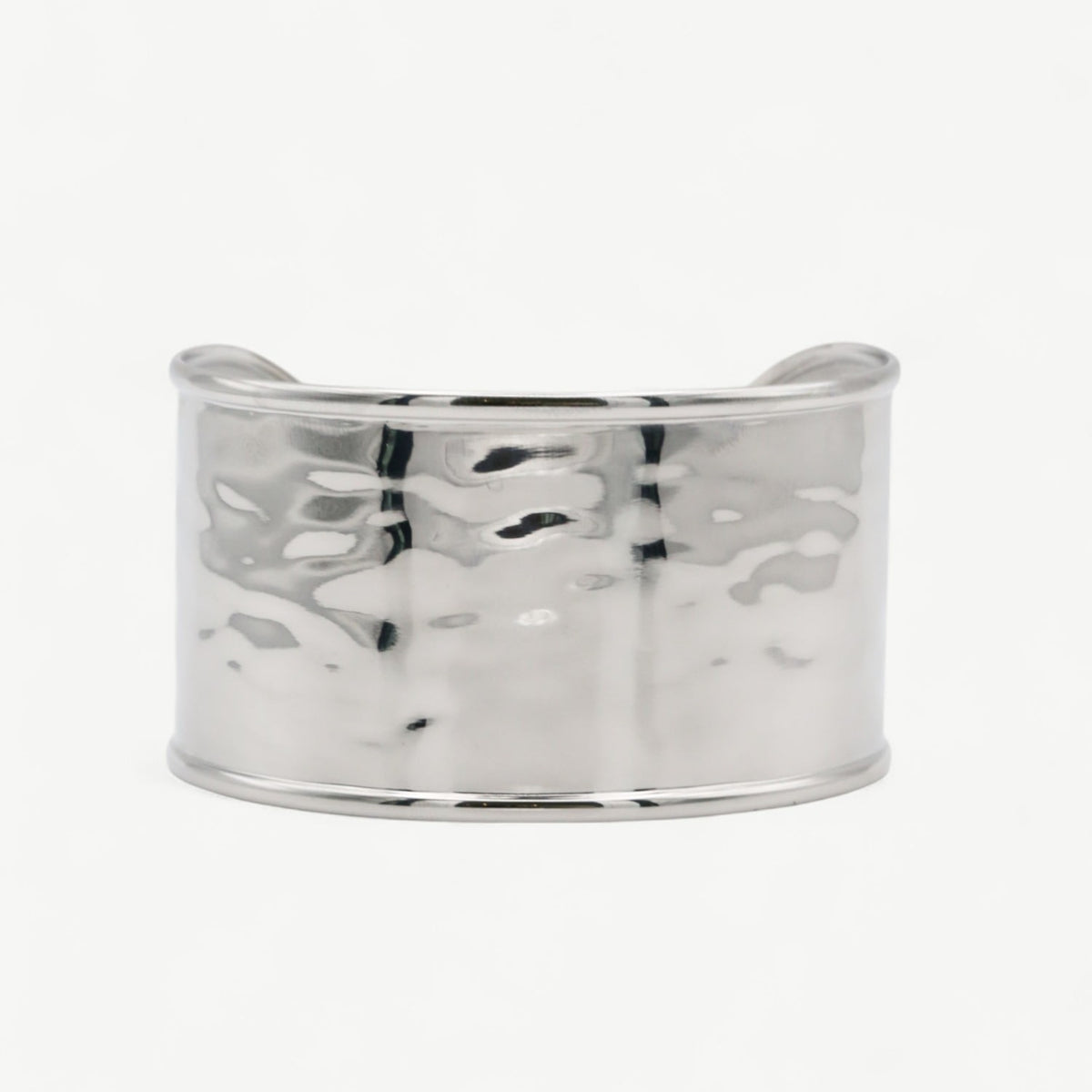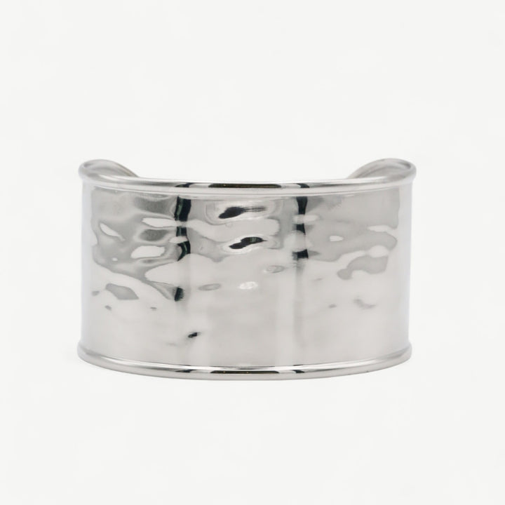 This chunky bangle is made of stainless steel with white gold plating. The width is 3.66cm and the inner diameter is adjustable.