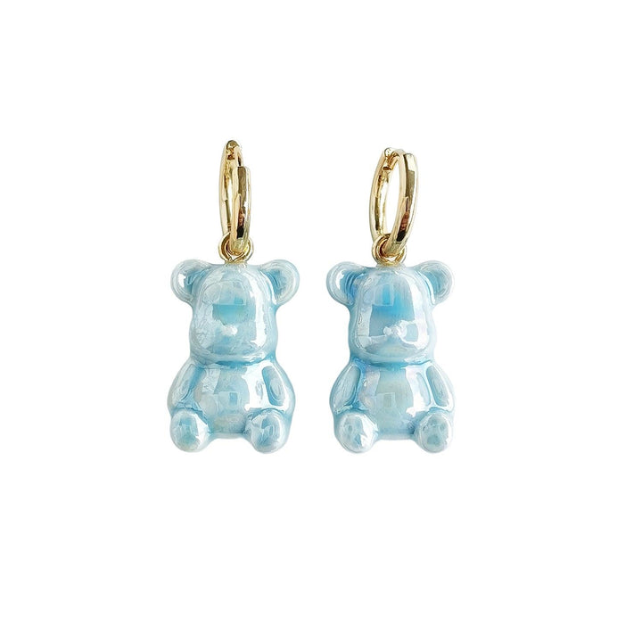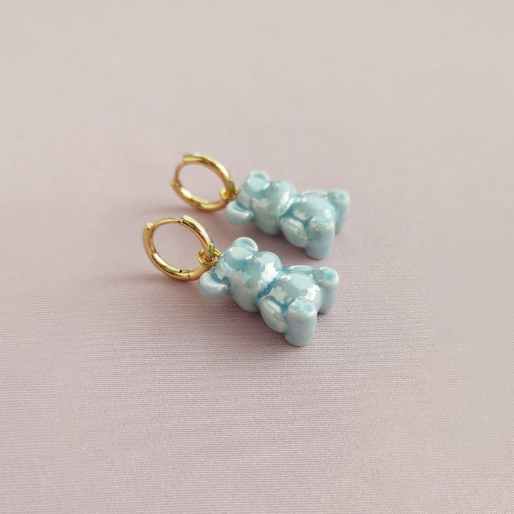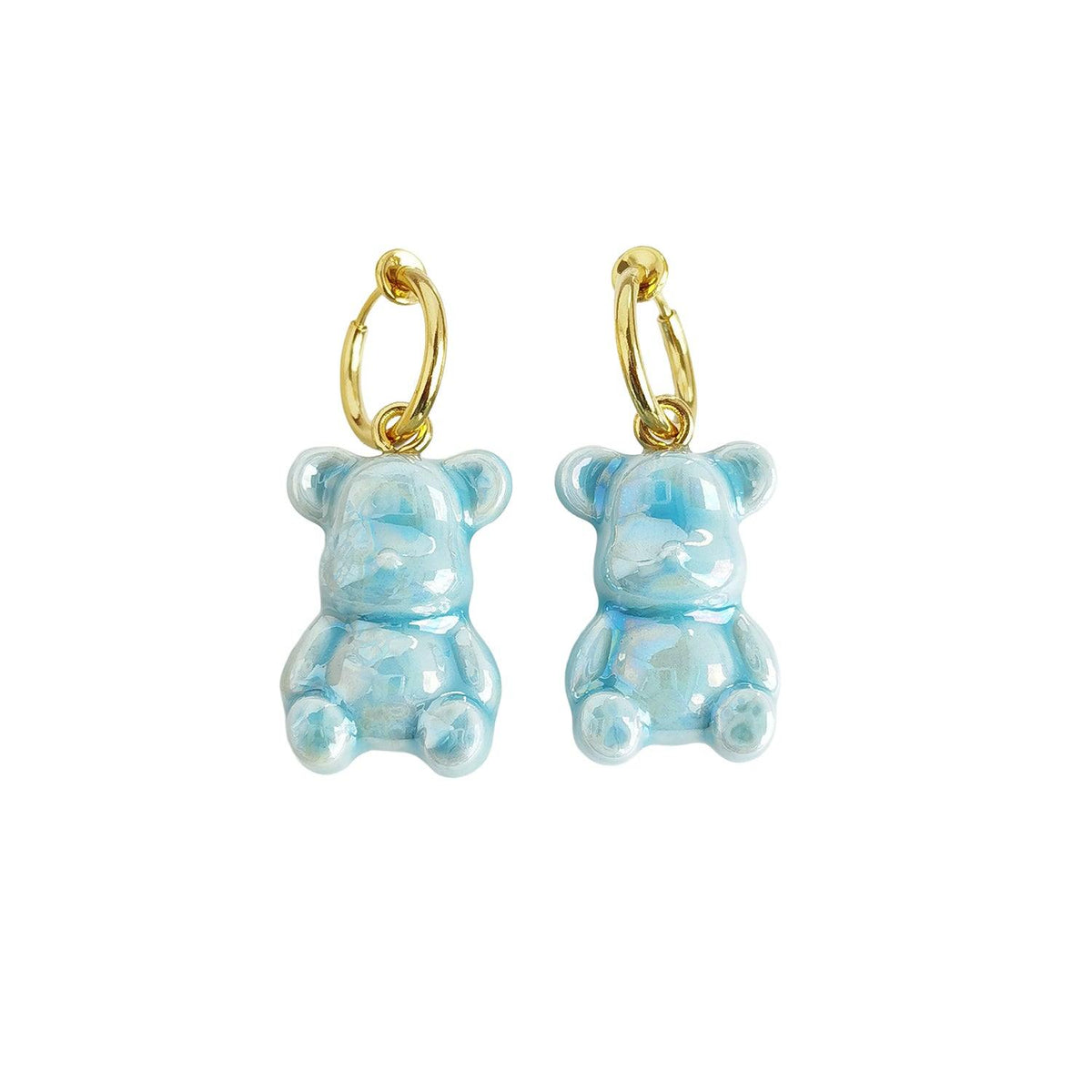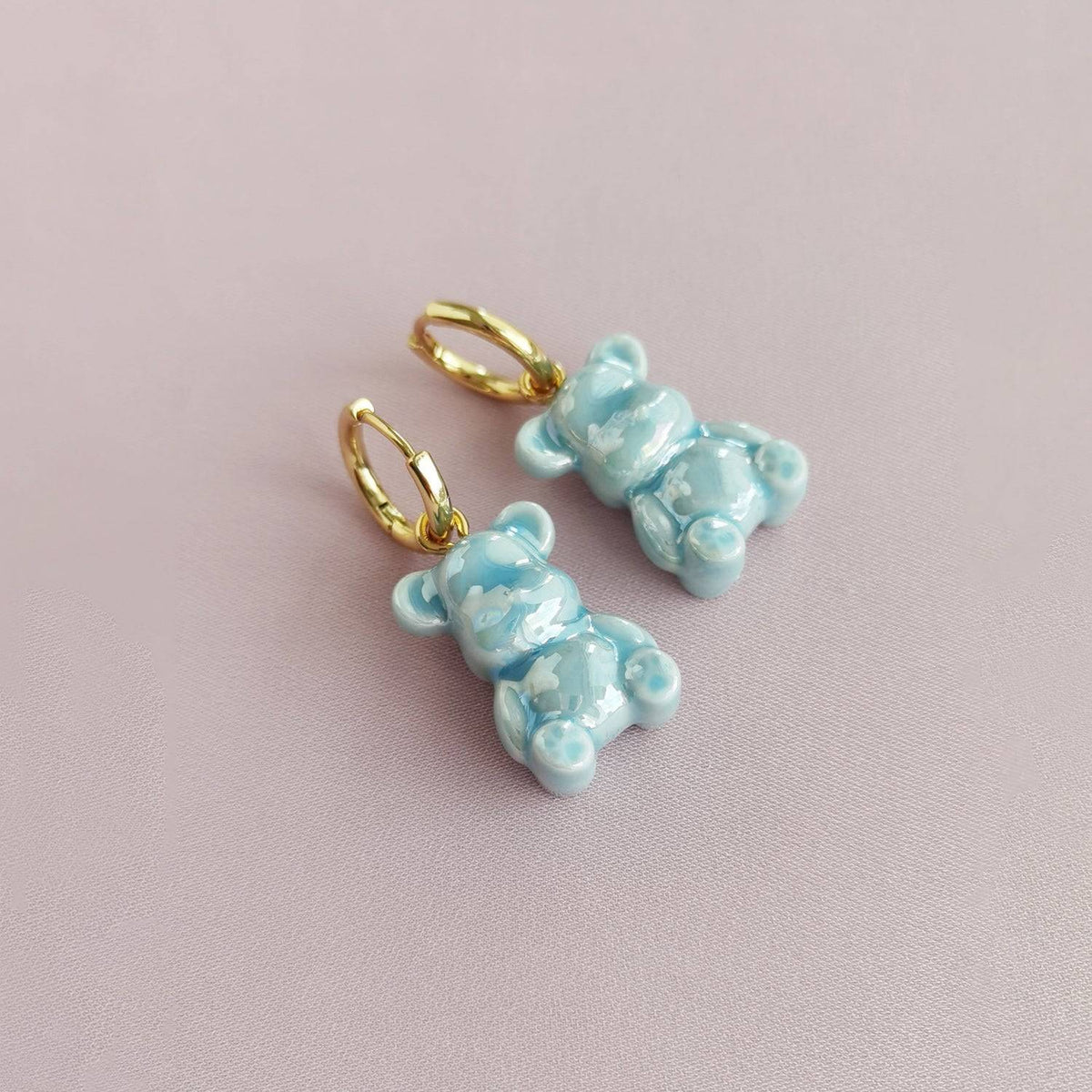 These Baby Blue Porcelain Teddy Bear Earrings by Poporcelain are whimsical and endearing, handcrafted to bring joy and charm. Each tiny teddy is double-sided with a sweet face on both sides, hand-painted with gold detailing for playful luxury. A delightful blend of artistry and humor, they make a thoughtful gift or a unique statement of fun-loving elegance.