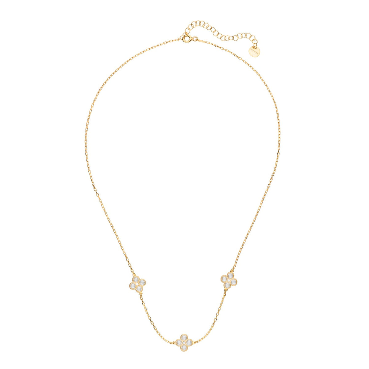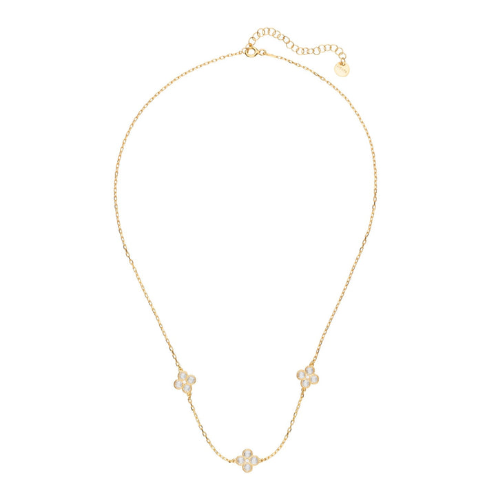 This Flower Clover Triple Choker Necklace in Gold by Latelita is delicate and symbolic. Featuring three zirconia-set clover motifs along a fine chain, it represents luck and elegance in equal measure. Ideal for chic everyday wear or as a bridal touch, it pairs beautifully with matching earrings and bracelet.