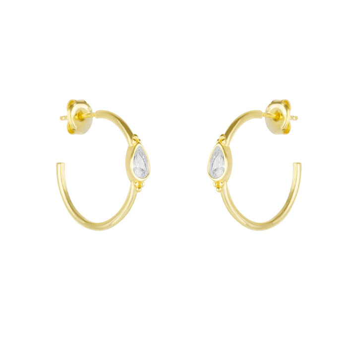 The Drop Solitaire Earring Sterling Silver White - Gold by Spero London adds sparkle to finesse your day-to-night look. Cast in a recycled 925 sterling silver metal, it features a unique hoop style with a drop-cut solitaire crystal at the center. The butterfly-post closure ensures a secure fit, and these earrings are perfect for styling alone or with other accessories for an iconic appearance.