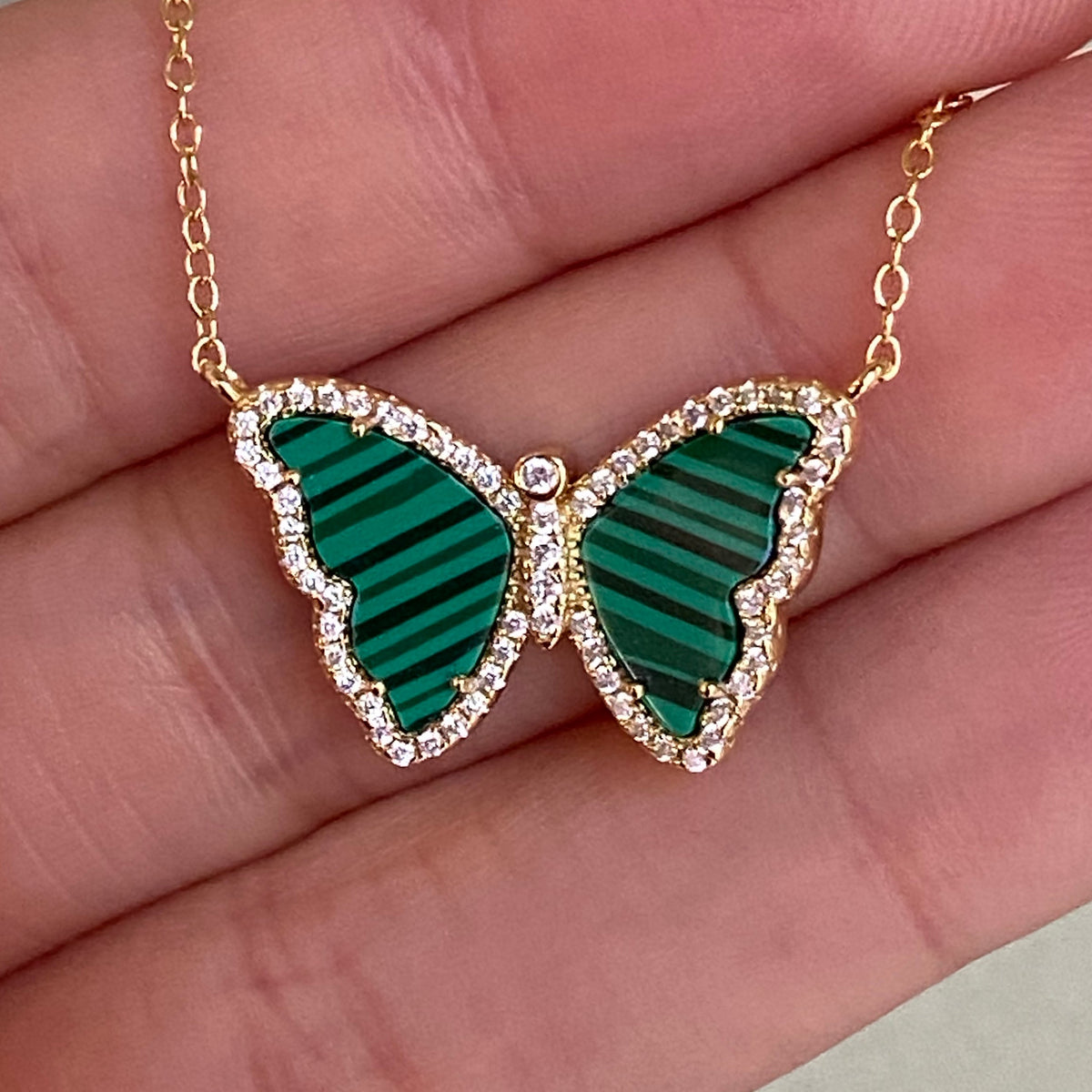 This Malachite Butterfly Necklace with Crystals by Kamaria celebrates transformation and renewal. The butterfly, a universal symbol of hope and rebirth, is brought to life with luminous lab-created malachite wings framed in shimmering pave crystals. Playful yet elegant, it layers beautifully with other necklaces while supporting a mission of empowerment.