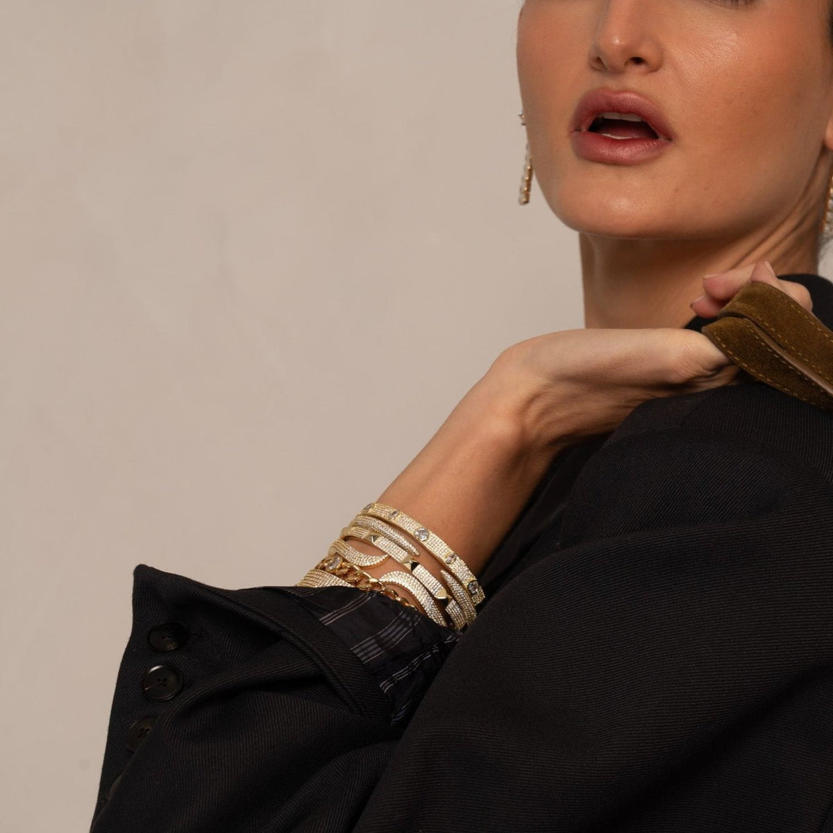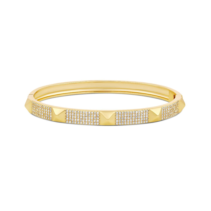 This Pave Studded Five Row Bangle - Gold by Shymi is a glamorous accessory. This oval-shaped bangle features a sparkling array of pave set cubic zirconia stones with studs in between, creating a five-row design. Made with 14k Gold Filled material, this bangle is perfect for creating stylish layered looks or for adding a glittering touch on its own. Its hinge closure makes it easy to wear.