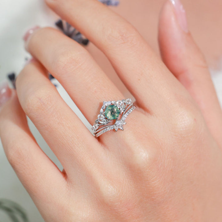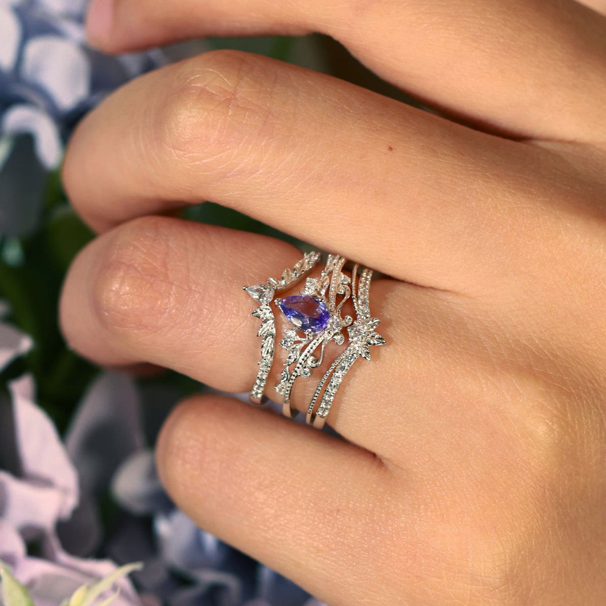 This Abloom Stacking Band by Azura Jewelry New York is a glowing piece crafted to bring out the best in you. It features a small, round white topaz gem at the center of fan-shaped sculpted leaves and a split shank topaz band. This ring is perfectly styled to stack with other rings but also stands out beautifully on its own. It embodies a sense of natural beauty and refined elegance, symbolizing personal growth and blossoming.