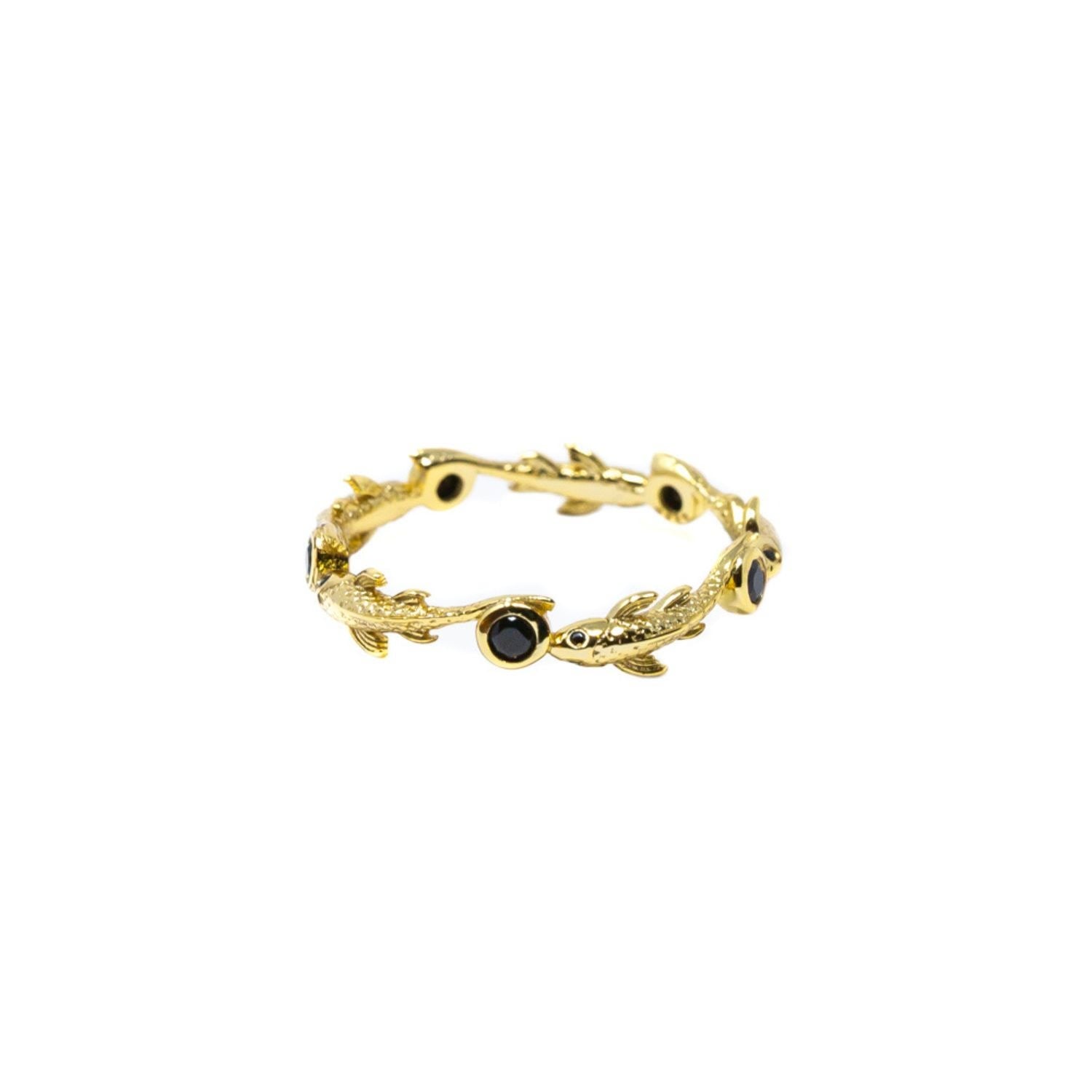 Cast in 925 solid sterling silver with 18k yellow gold vermeil. Set with onyx gemstones and accented with black spinel in the eyes of the fish motif.