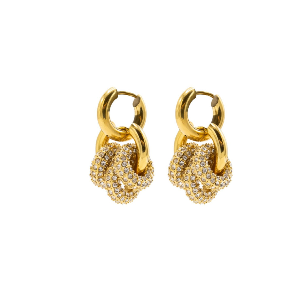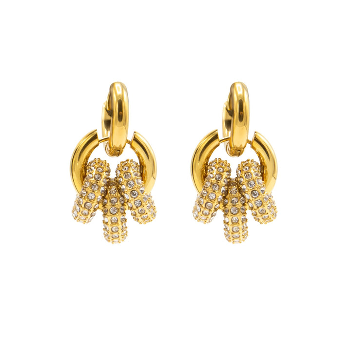 These earrings are made from 18k gold-plated material and feature cubic zirconia crystals. They have a gold finish with three crystal-encircled rings.