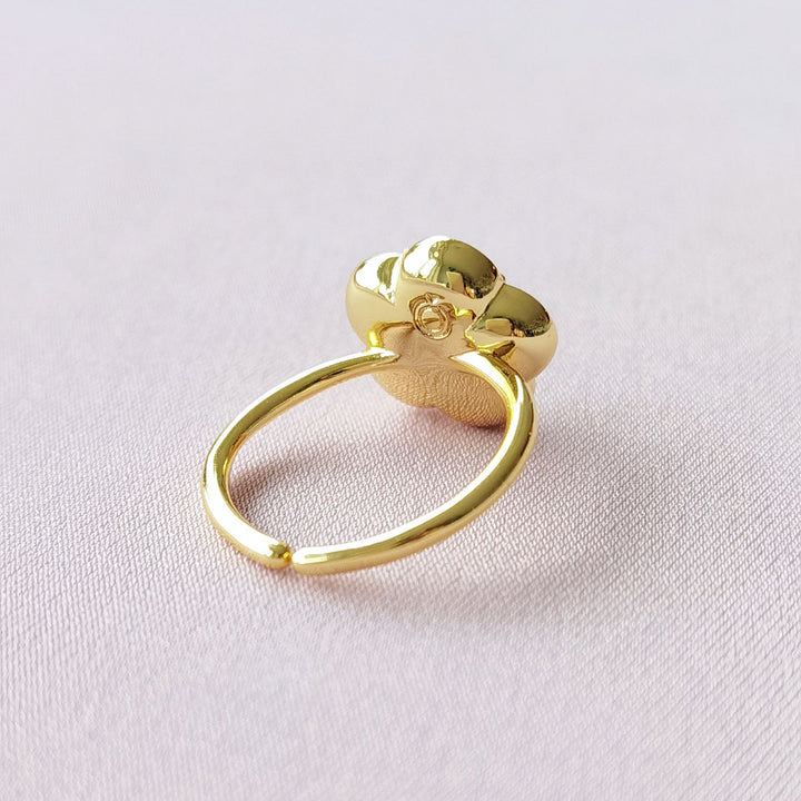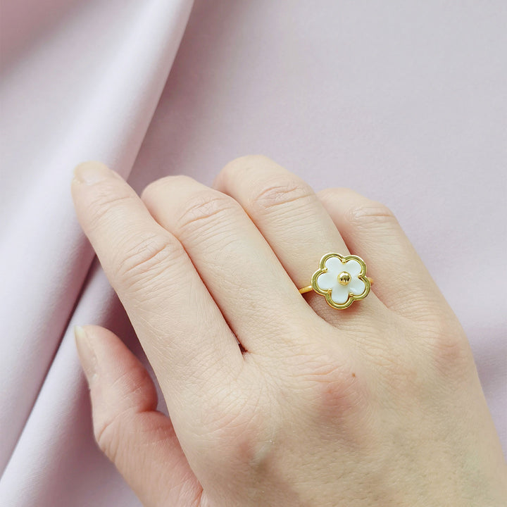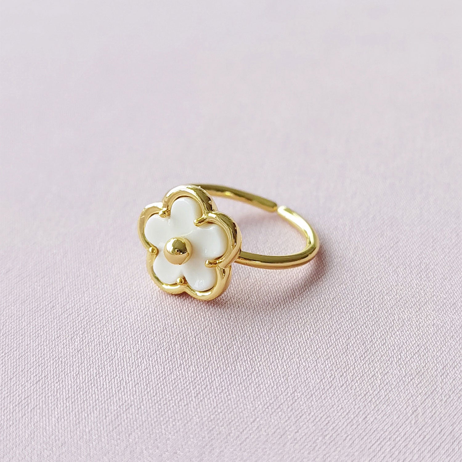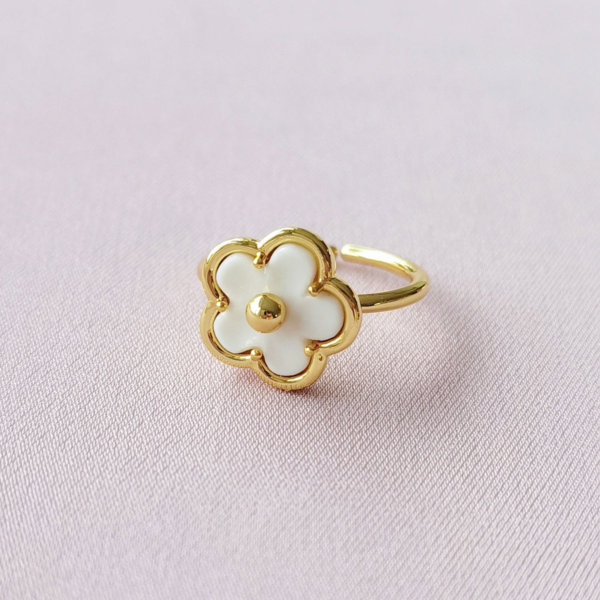 This adjustable ring is made with handcrafted porcelain and 18K gold-plated brass. It features a white and gold daisy.