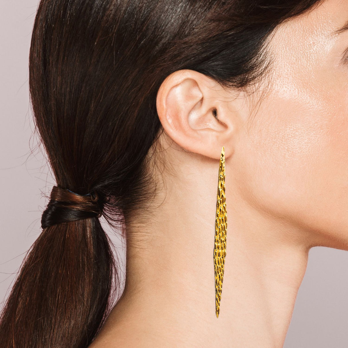 These handcrafted earrings are made from 18K gold with a clear E-Coating for durability. They feature a unique abstract, swipe-like shape and are designed to be a statement piece.