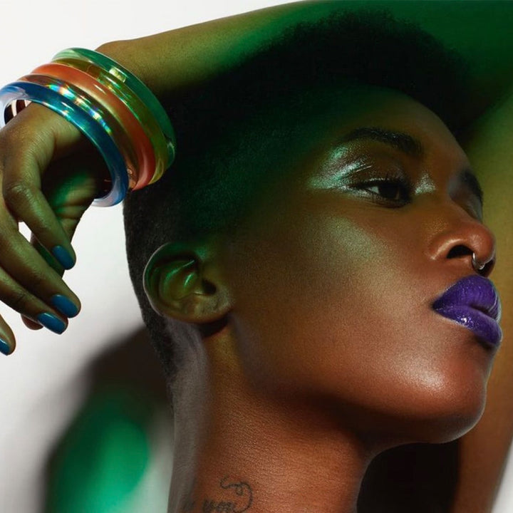 The Iridescent Bangle In Yellow by Gold & Honey is a nostalgic accessory for anyone who loves color. This slip-on bracelet is made of handcrafted Lucite with hand-painted enamel, giving it a rainbow iridescent design. This bangle is a 90s baby's dream come true, and you can stack multiple together for a vibrant and playful arm candy delight. The lightweight acrylic material makes it comfortable for all-day wear.