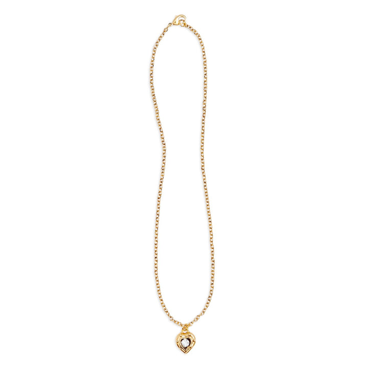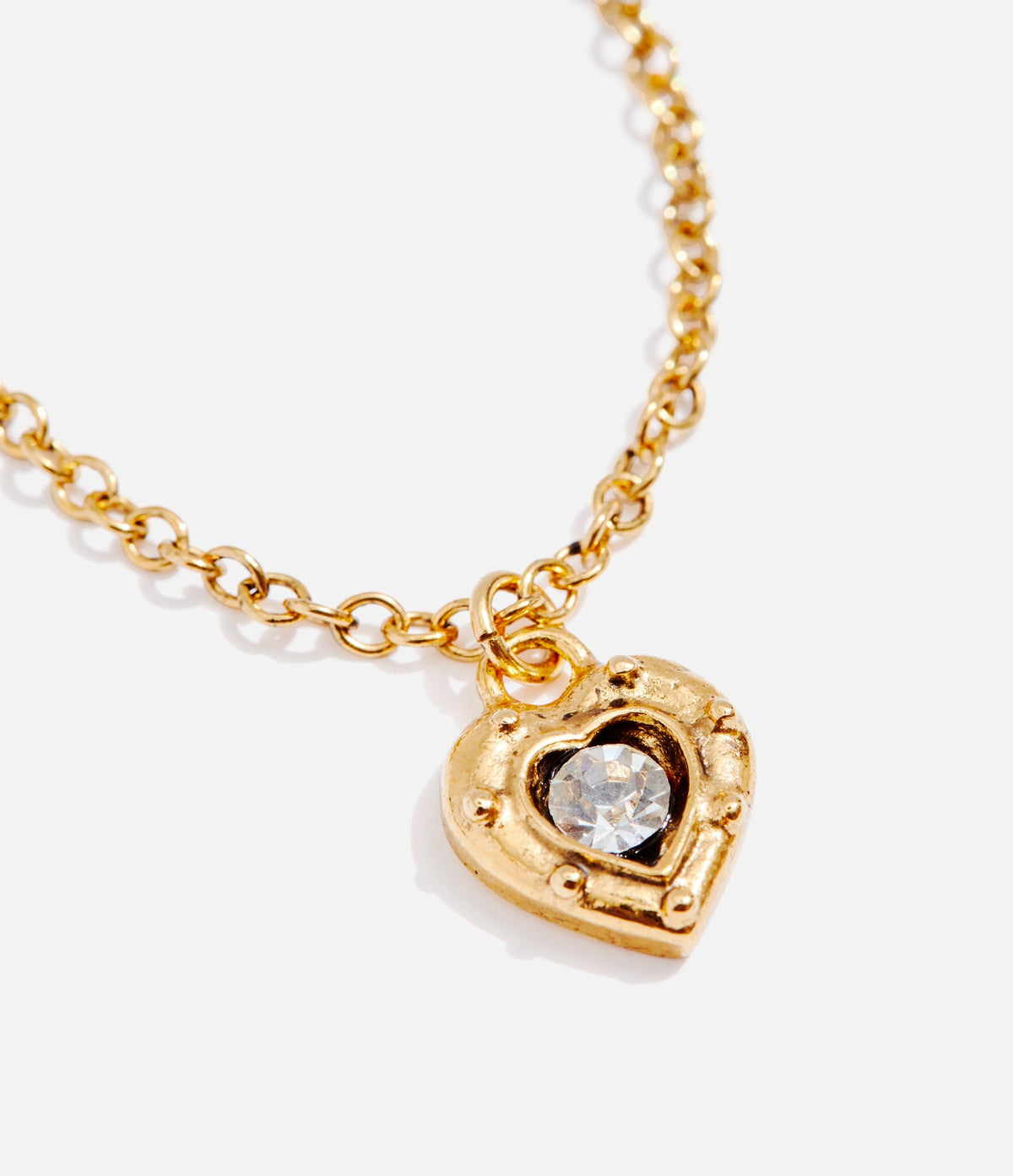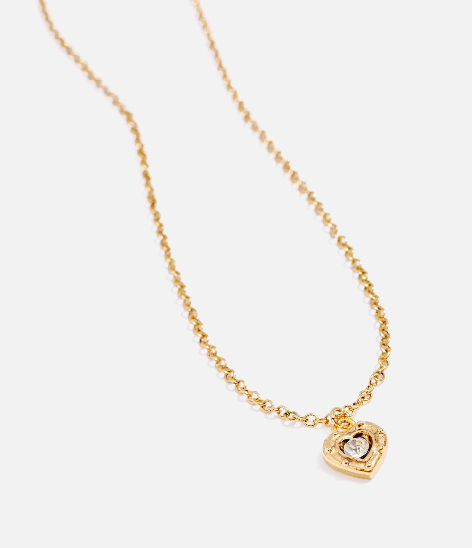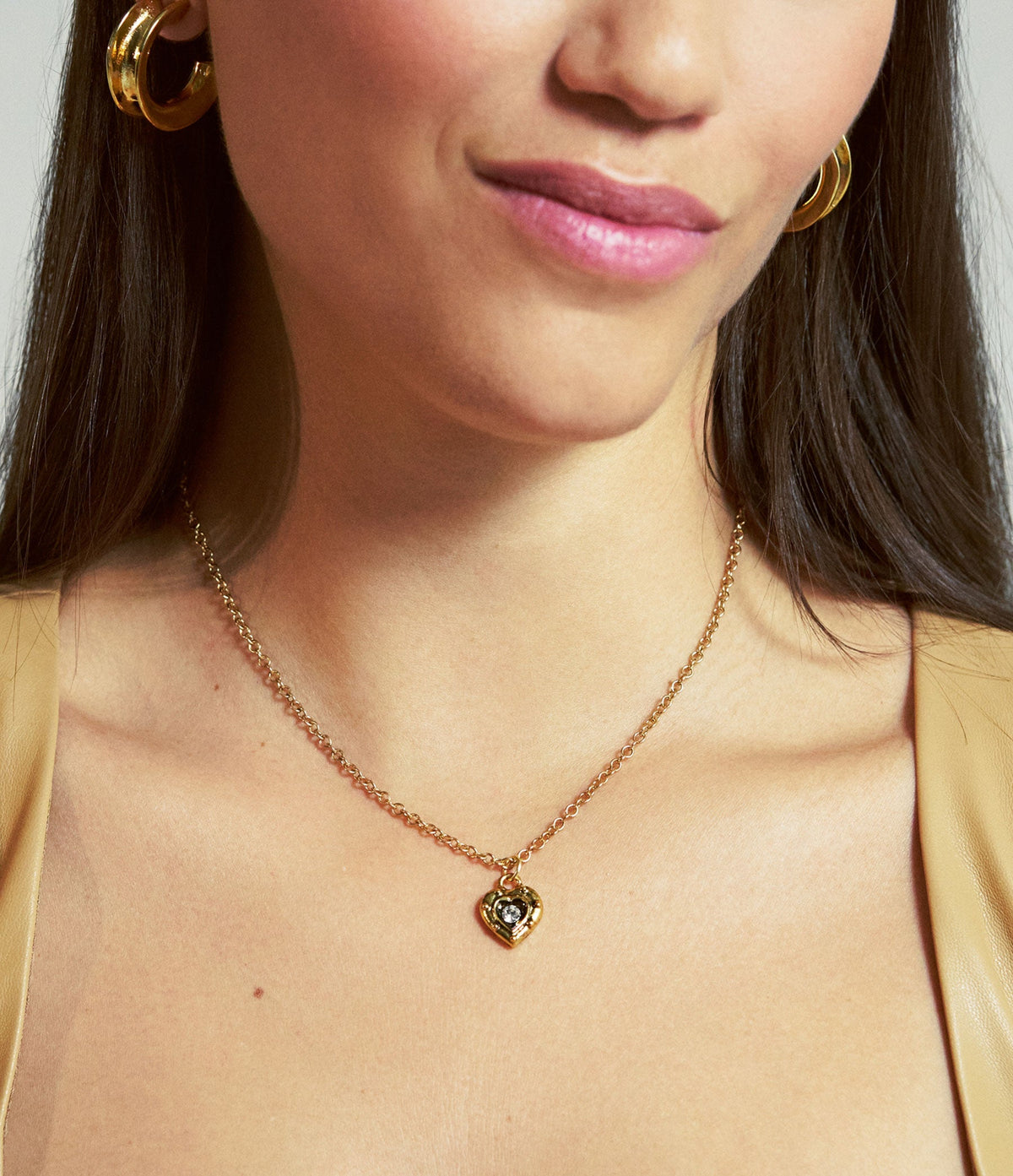This necklace is handcrafted from 18k gold-plated brass and features a heart pendant with an inlaid rhinestone crystal.