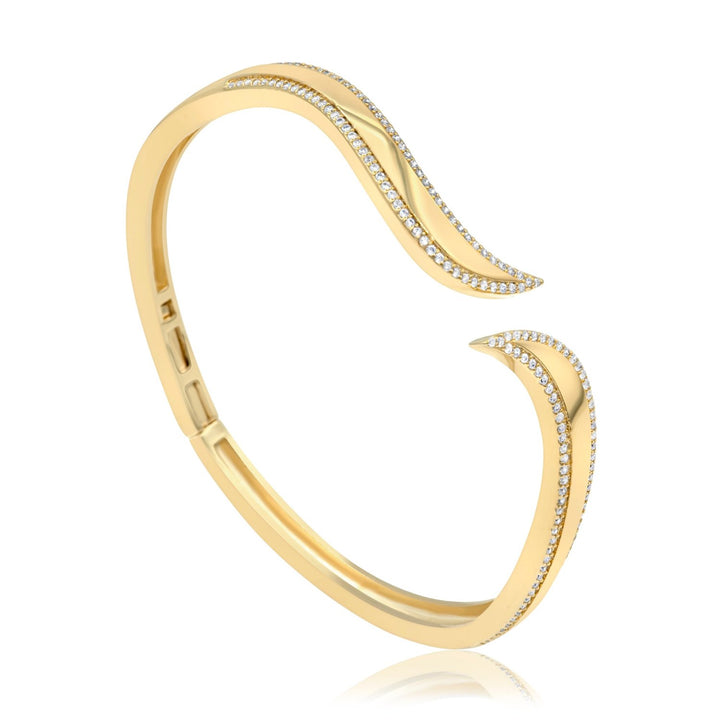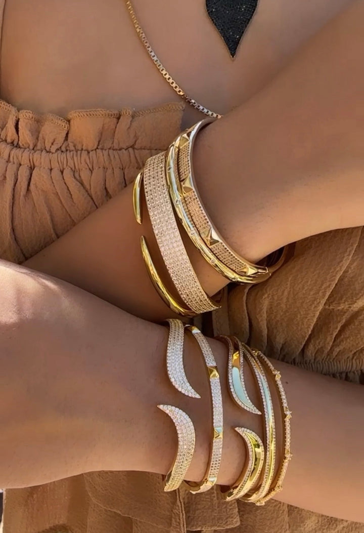 This Pave Outline Curl Cuff by Shymi is the epitome of luxury and elegant simplicity. Its unique, curved design gracefully hugs the wrist, creating a beautiful and feminine silhouette. The cuff is meticulously crafted with crystals pave-set around its border, adding a dazzling and sophisticated sparkle that catches the light with every movement. The closure-free design makes it effortlessly easy to slip on and off, offering both comfort and stunning visual impact.