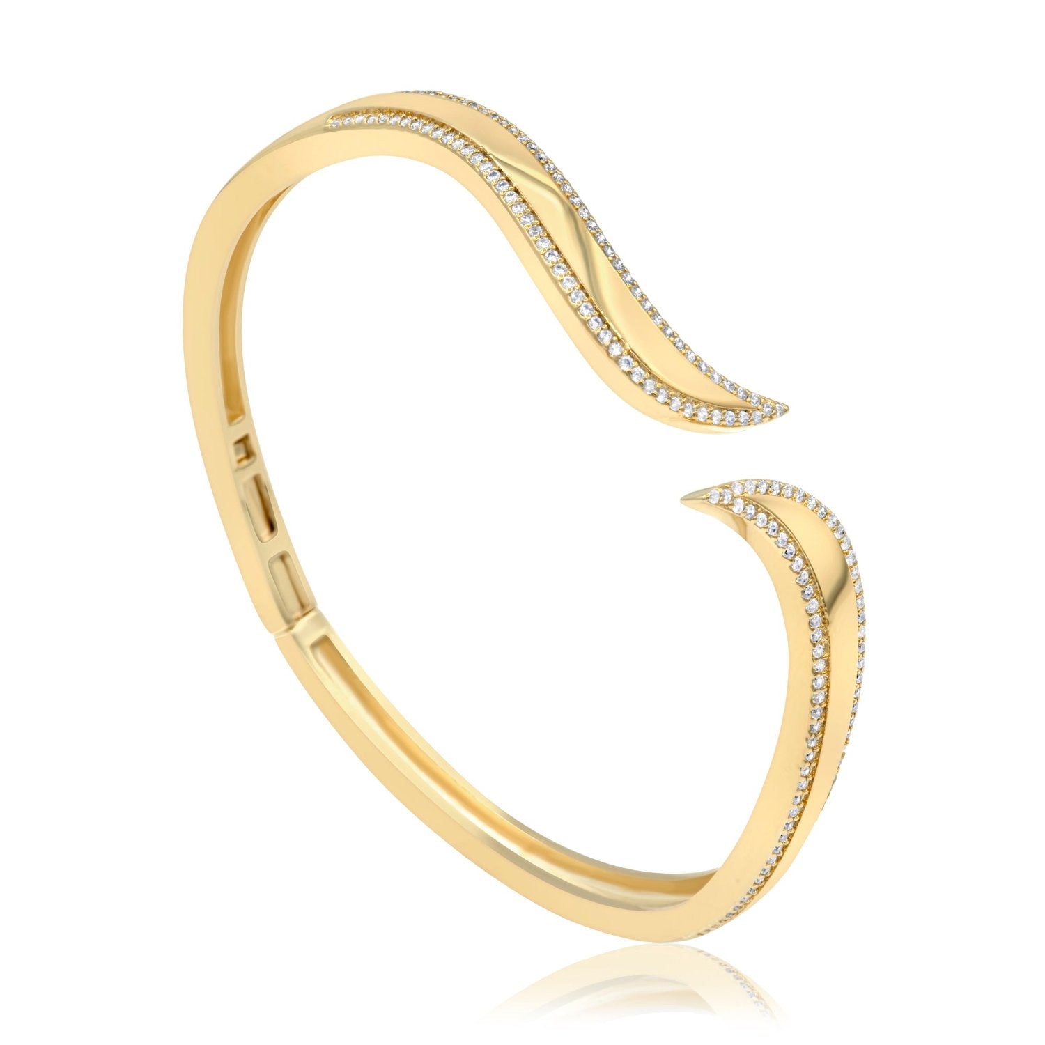 This cuff bracelet is made from 14k gold-filled metal and is pave-set with cubic zirconia crystals. It has an oval shape and is sized M/L with no closure.