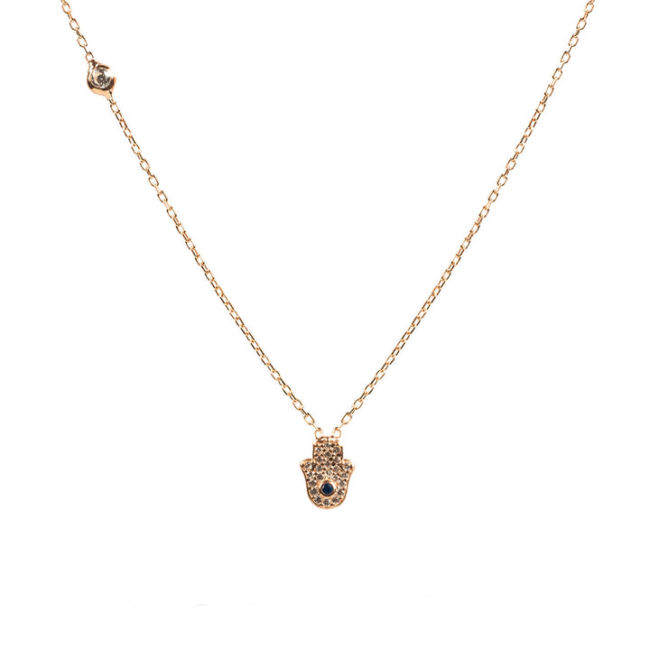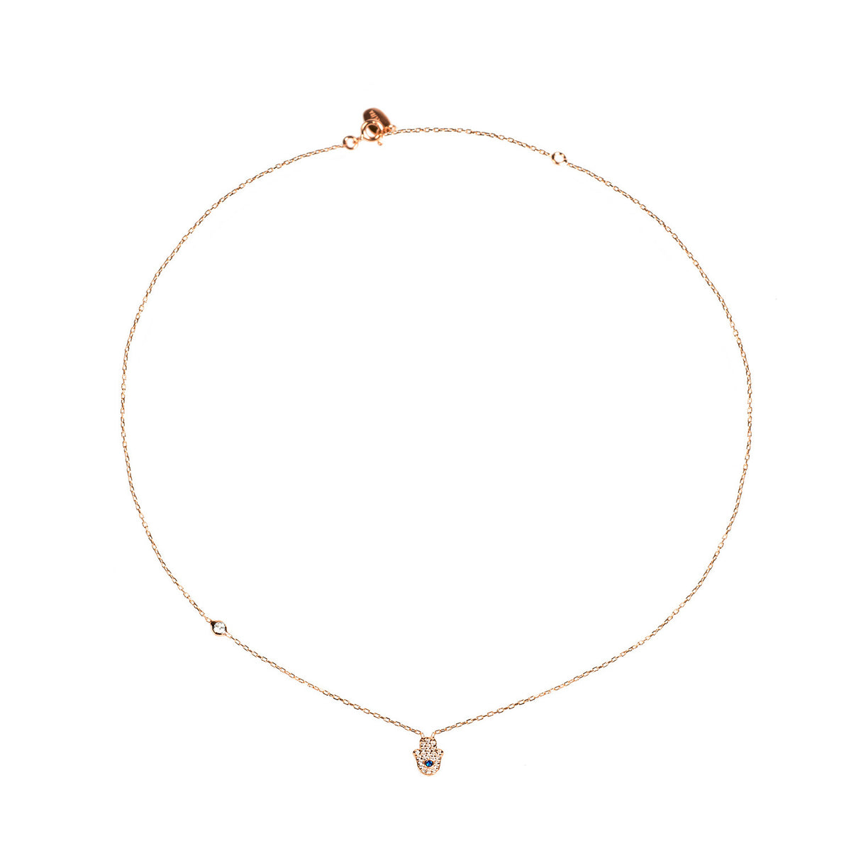 This necklace is crafted from 925 sterling silver and is dipped in 18-karat rose gold. It features multifaceted white zircons and has a lobster clasp with a size adjuster.