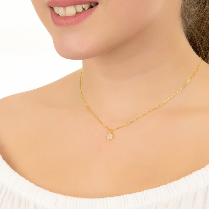 This necklace is made from 925 sterling silver, dipped in 18ct gold. It features a mini teardrop-shaped rose quartz stone. It has an adjustable fine chain with a lobster clasp.
