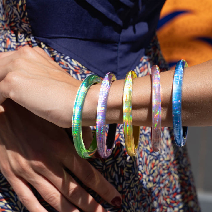 This slip-on bangle is made of handcrafted Lucite with hand-painted enamel. The bangle has an iridescent finish.