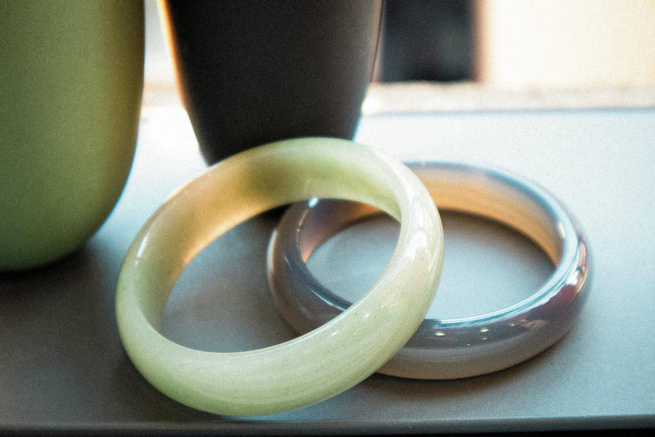 This bangle is crafted by hand from natural quartzite. It weighs 56g, has a thickness of 5mm, and is available in XS, S, M, and L sizes based on diameter.
