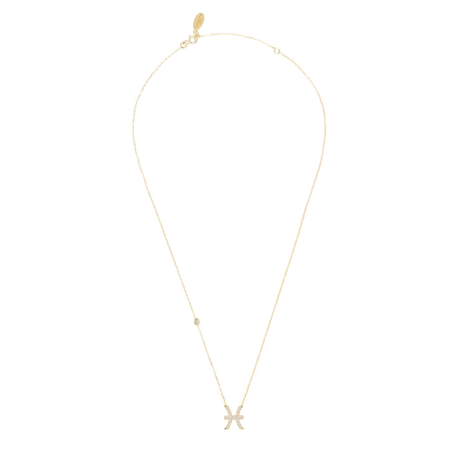 This necklace is made of 925 sterling silver, dipped in 22ct gold, and hand set with multifaceted white zircons. It features a Pisces pendant and is finished with a lobster clasp and size adjuster.