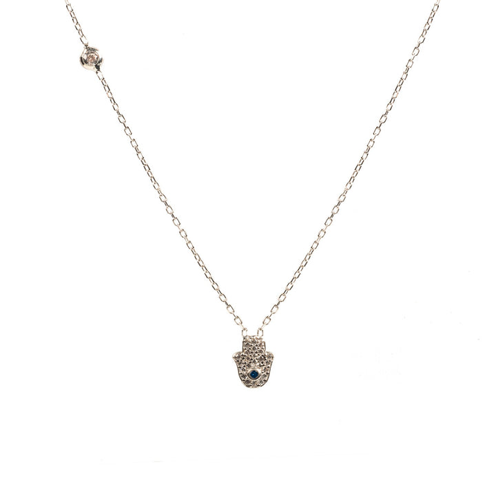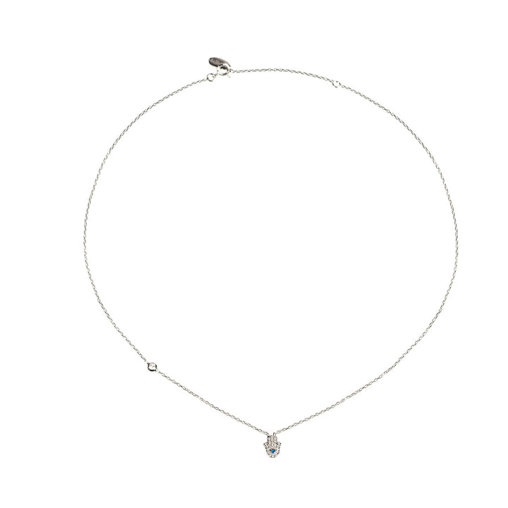This Hamsa Hand Necklace Silver by Latelita is a simple yet chic everyday accessory. This necklace features the Hamsa hand, an ancient apotropaic amulet for magical protection from the evil eye. Handcrafted in sterling silver, the Hamsa hand is adorned with sparkling white zircons for a dazzling shine. This piece is perfect for wearing singularly for a subtle, protective look or layering with other necklaces for a more dramatic style. It is a beautiful and meaningful piece for any collection.