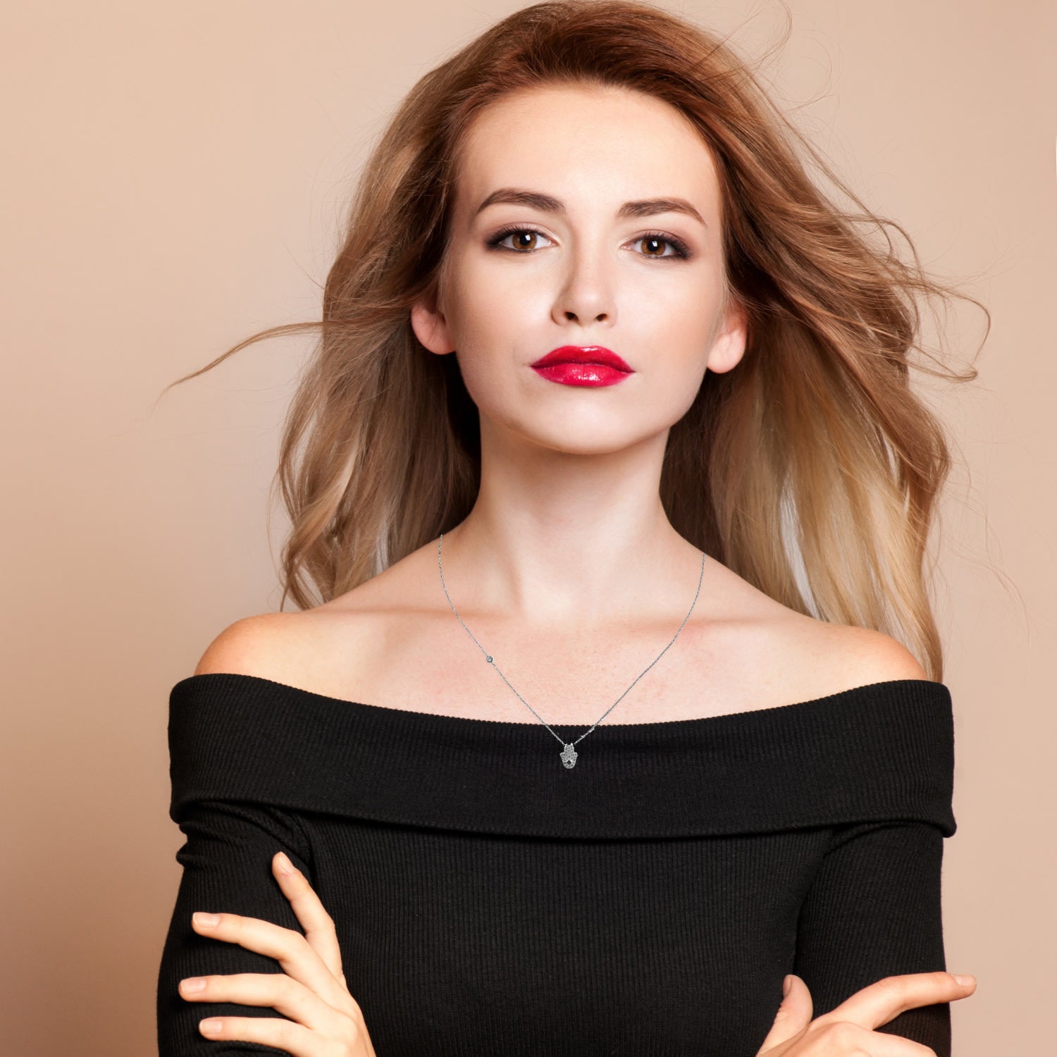 This necklace is handcrafted from 925 sterling silver and is dipped in rhodium. It is adorned with white zircons and features a lobster clasp and size adjuster.