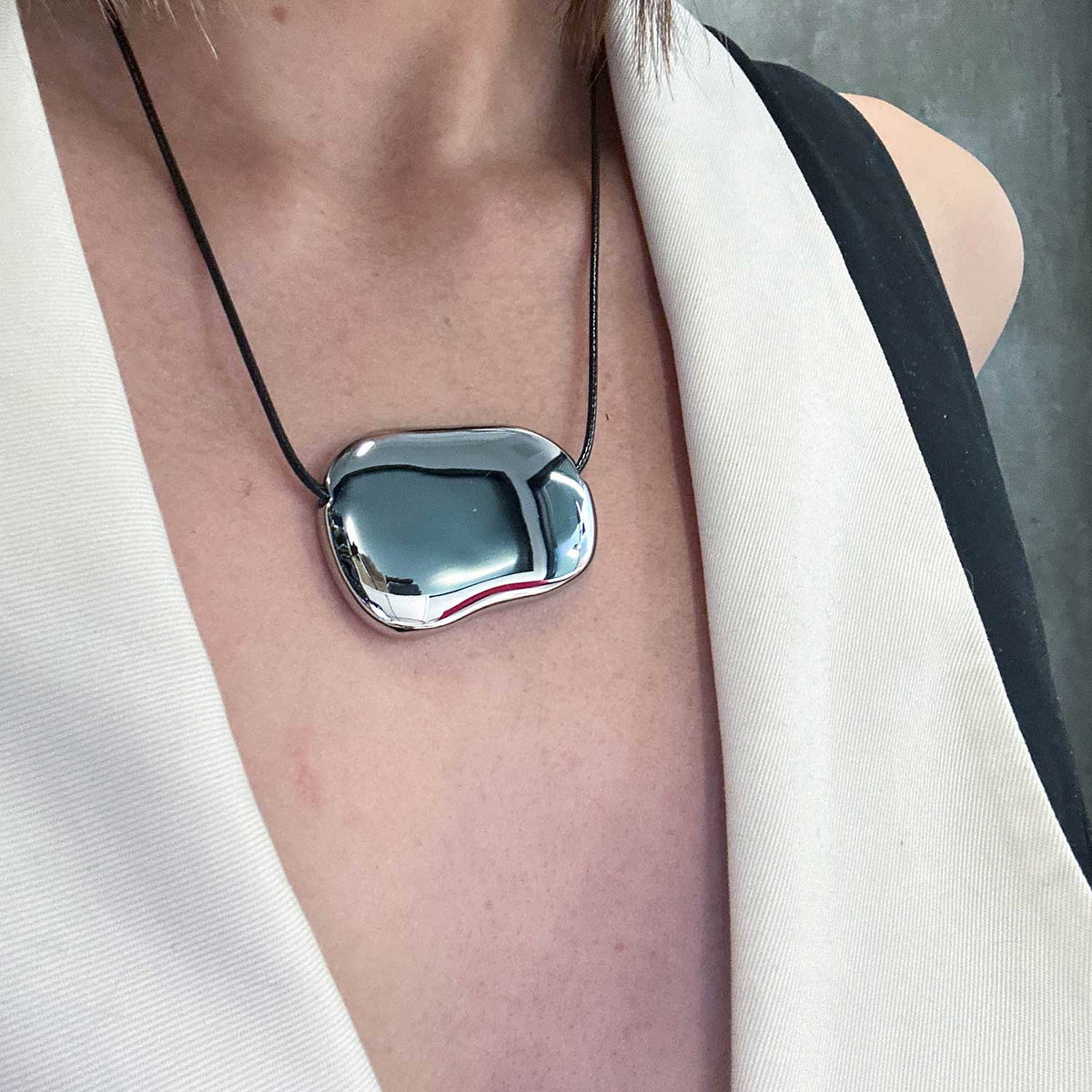 This Linda Cord Vegan Leather Necklace Silver by Outofoffice is a bold yet versatile piece with a sculptural edge. It features a structured vegan leather cord that hugs the neckline with effortless elegance and is finished with high-shine metal accents. This lightweight and adjustable necklace is ethically made and perfect for layering or wearing solo. It's a fashion-forward staple for conscious consumers who value modern design and cruelty-free materials.