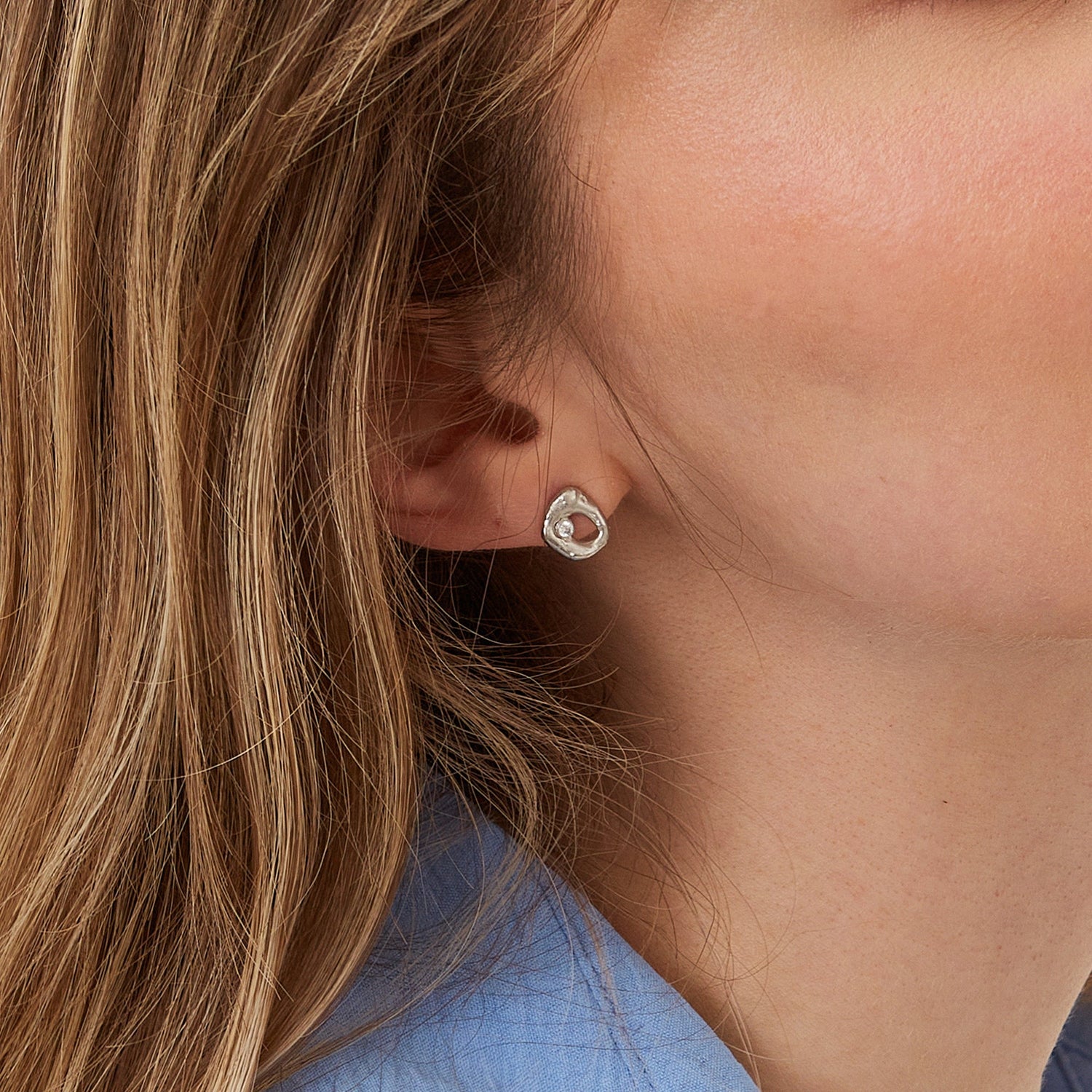 These stud earrings are made from 925 recycled sterling silver and are set with a crystal. They feature a dripping molten natural textured design.