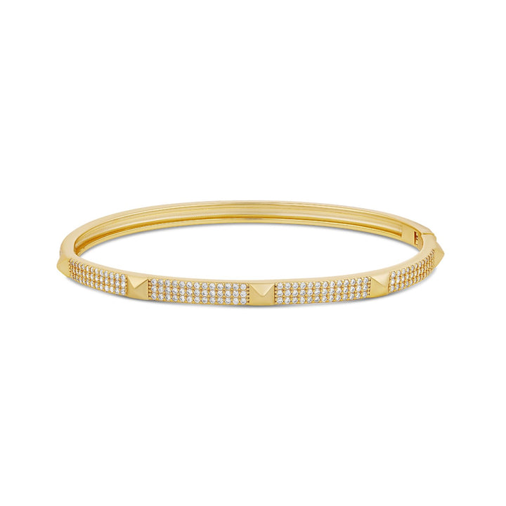 This bangle is crafted from 14k gold-filled metal. It is a medium/large oval shape with an easy-to-close hinge and is studded with cubic zirconia stones.