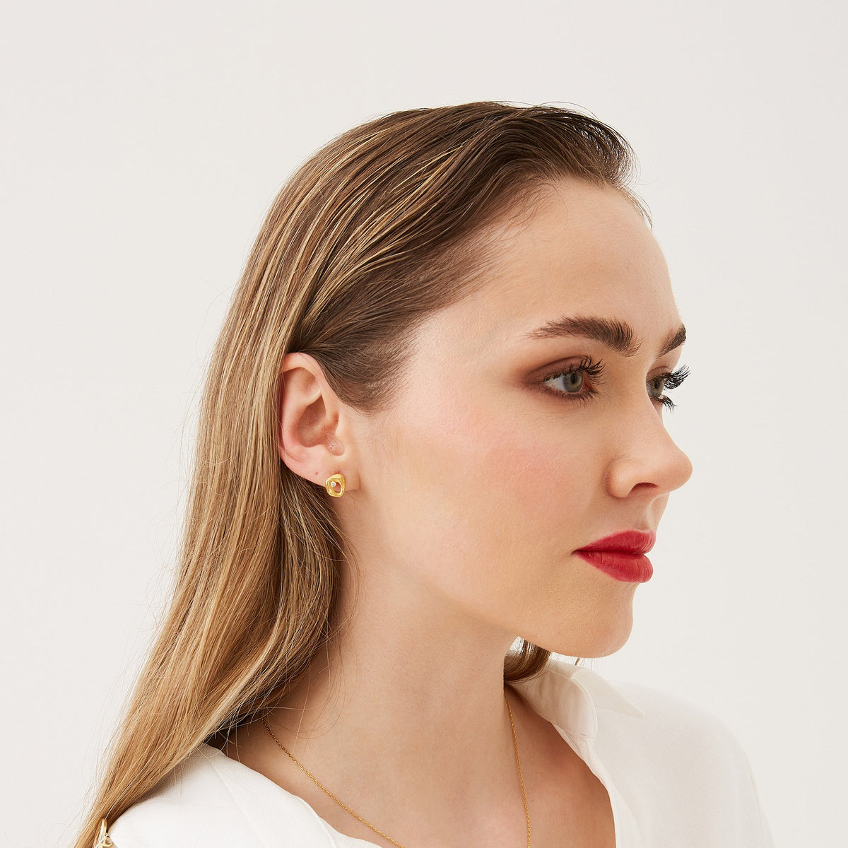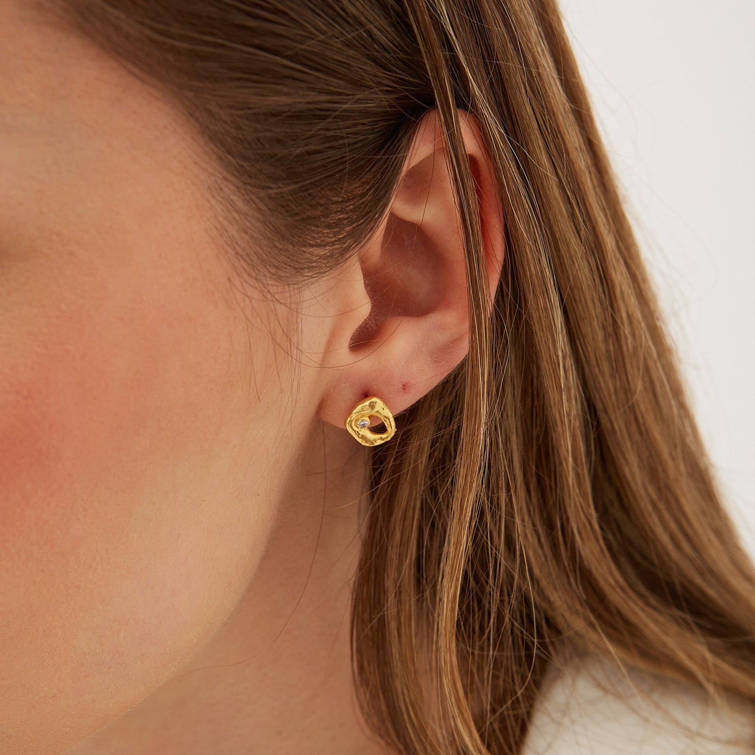 These stud earrings are made from 925 recycled sterling silver with a gold finish and are set with a crystal. They feature a dripping molten natural textured design.