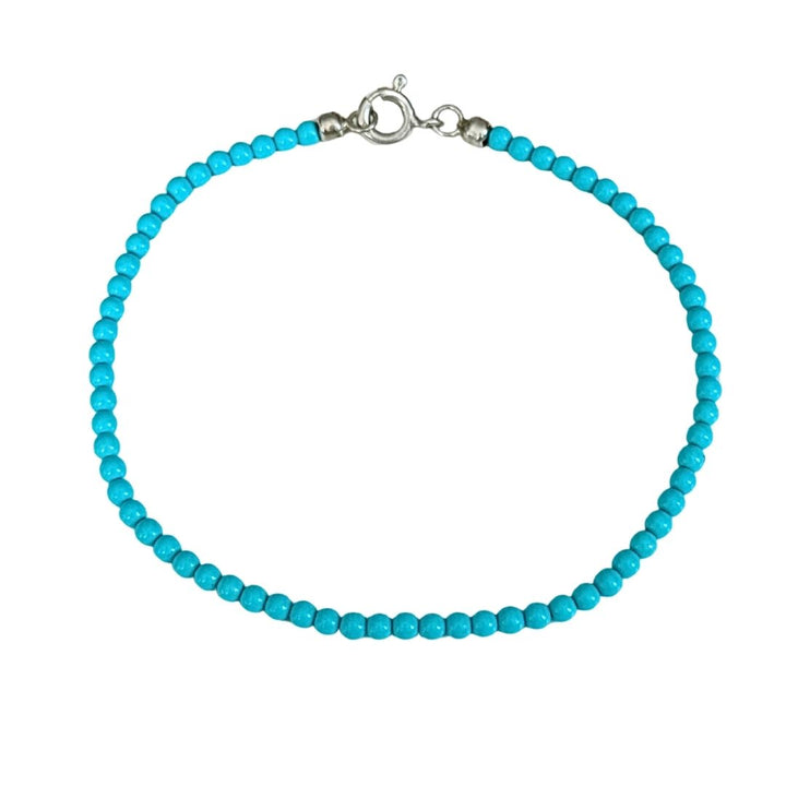 This Dainty Turquoise Beaded Bracelet by Nazzar is a charming and minimalist accessory. It features genuine turquoise stones strung on a fine sterling silver chain, offering a bohemian charm and a pop of natural color. Lightweight and versatile, this handmade bracelet from Capri, Italy, is perfect for solo wear or for layering with other pieces.