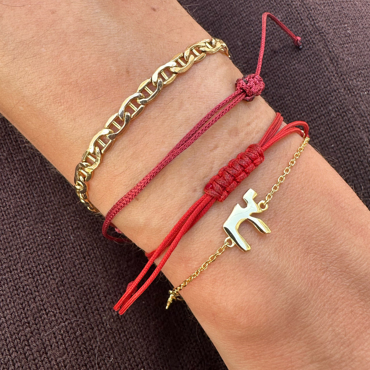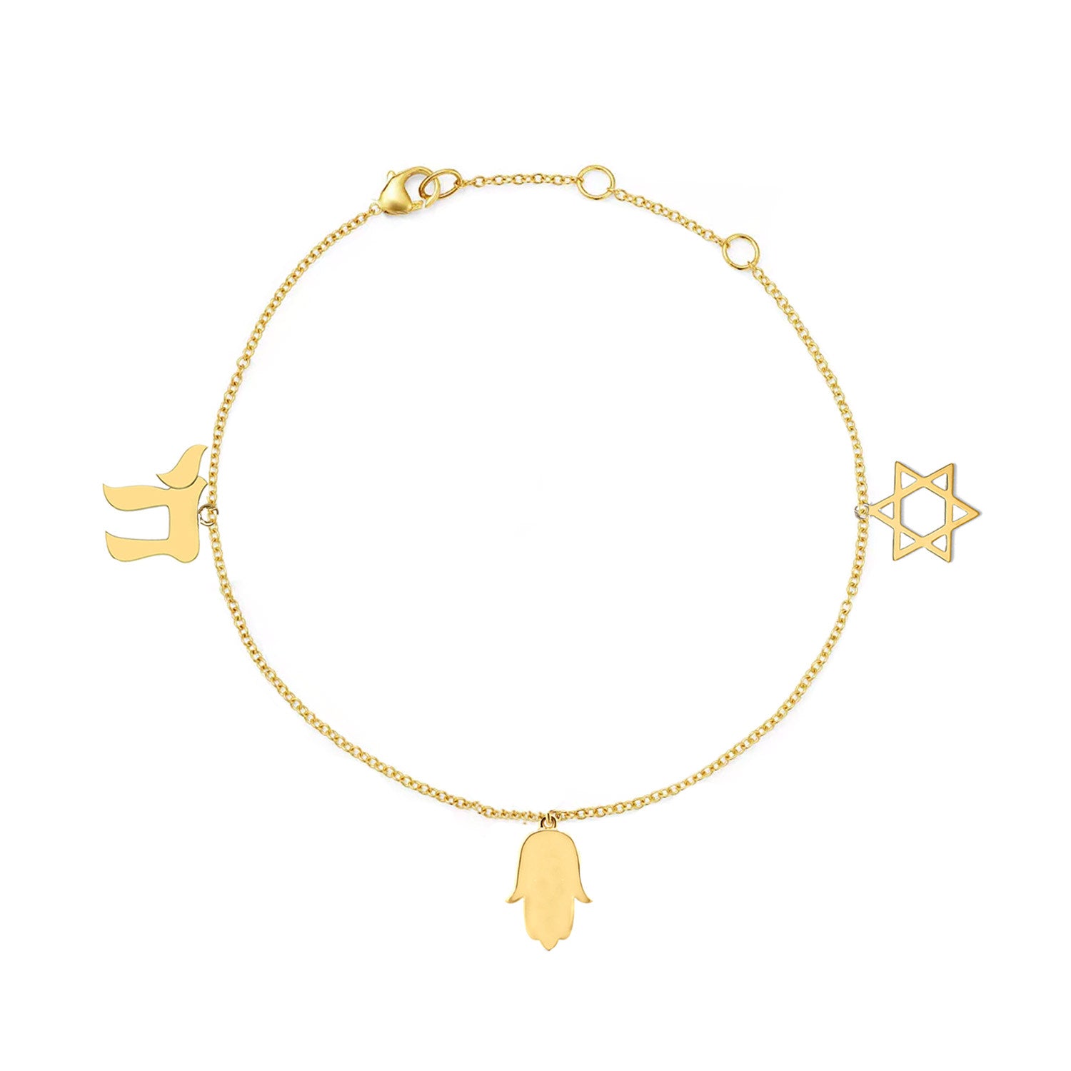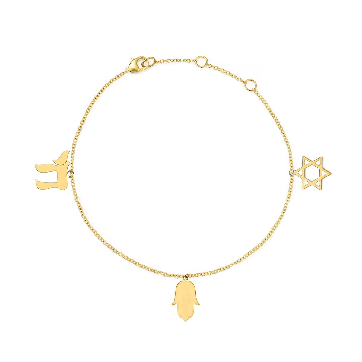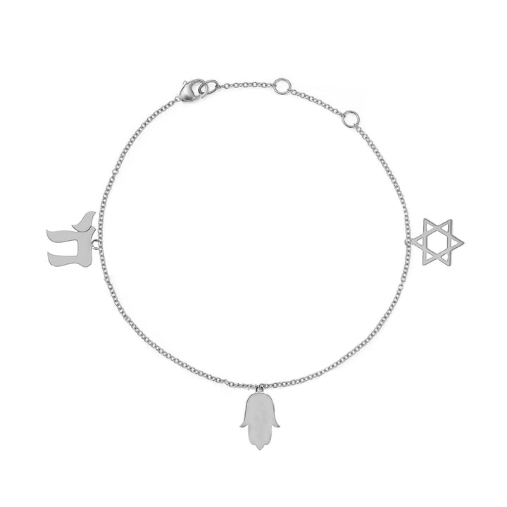 This adjustable bracelet is made from .925 sterling silver and features a Star of David charm, a Hamsa hand charm, and a Chai symbol charm.