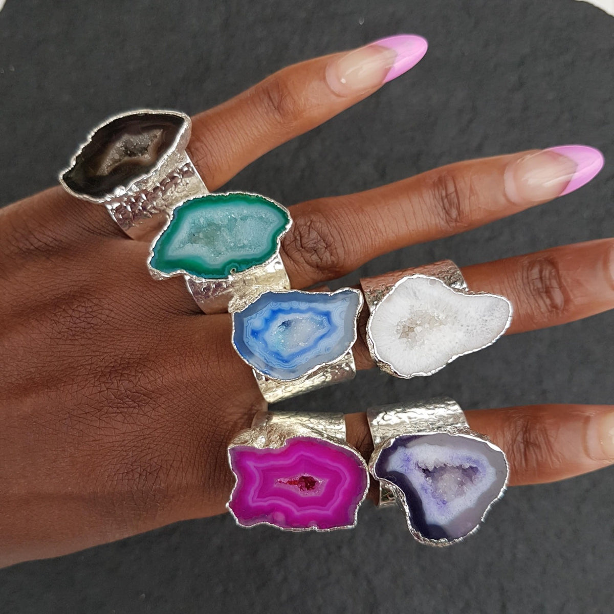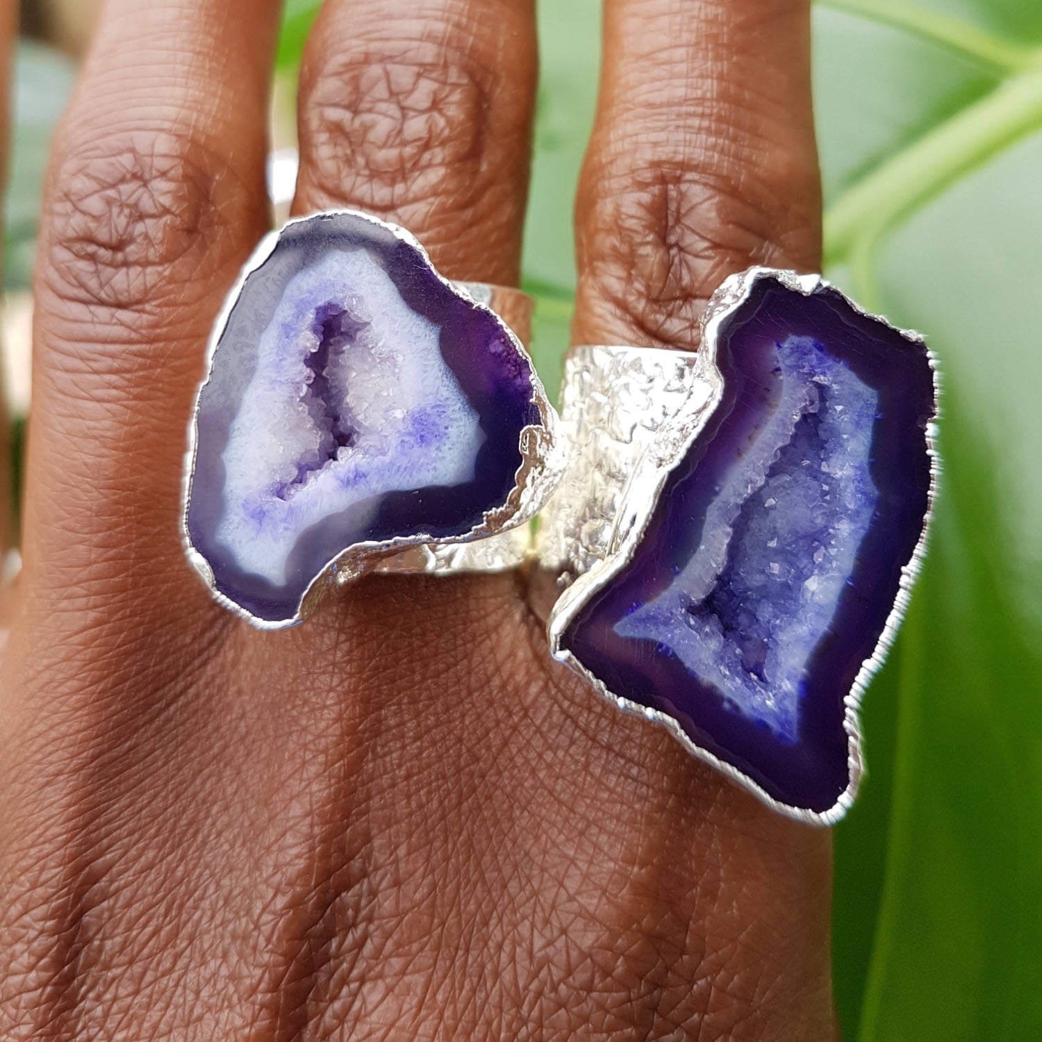 This statement ring features a chunky agate druzy crystal gemstone set in a silver-plated thick band of brass.