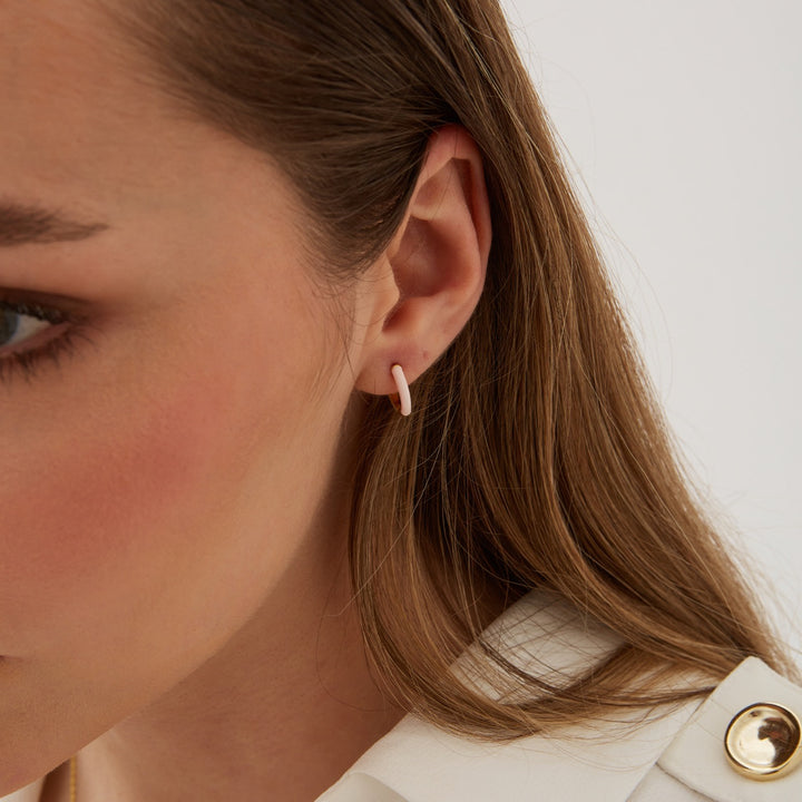 These earrings are crafted from recycled 925 sterling silver. They feature a mini hoop design with pink and blue enamel and a hinged-back lock.